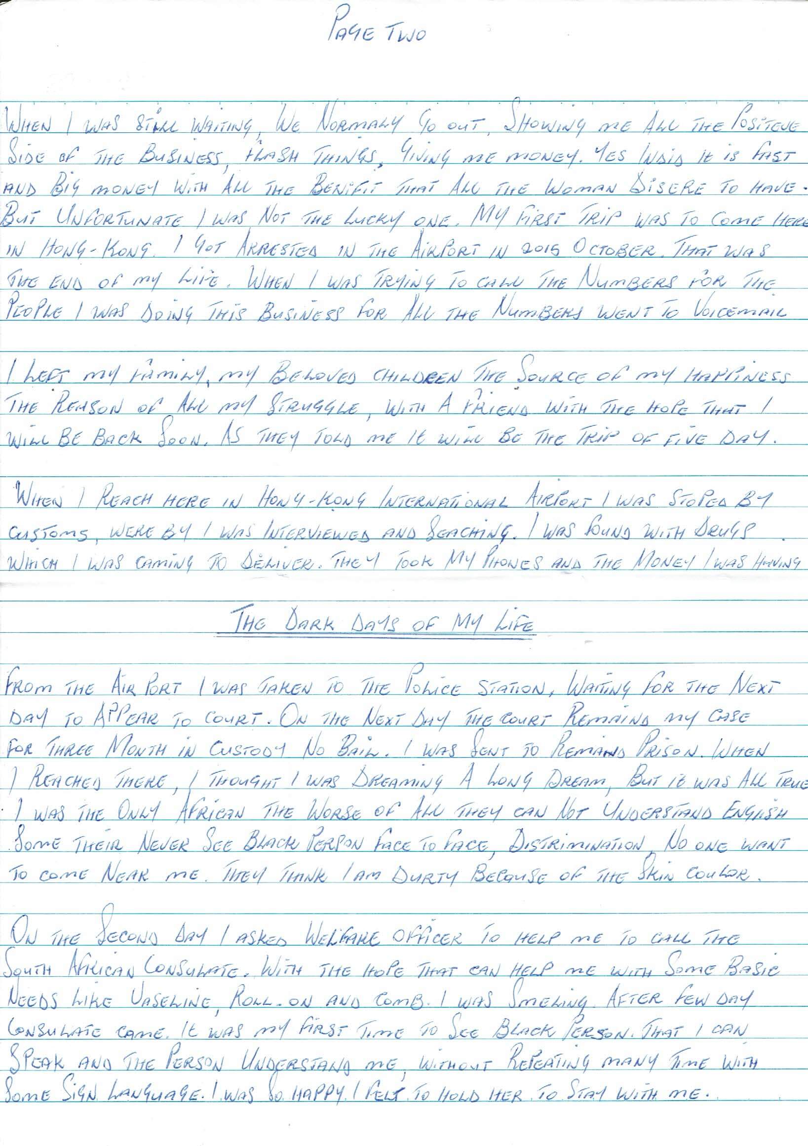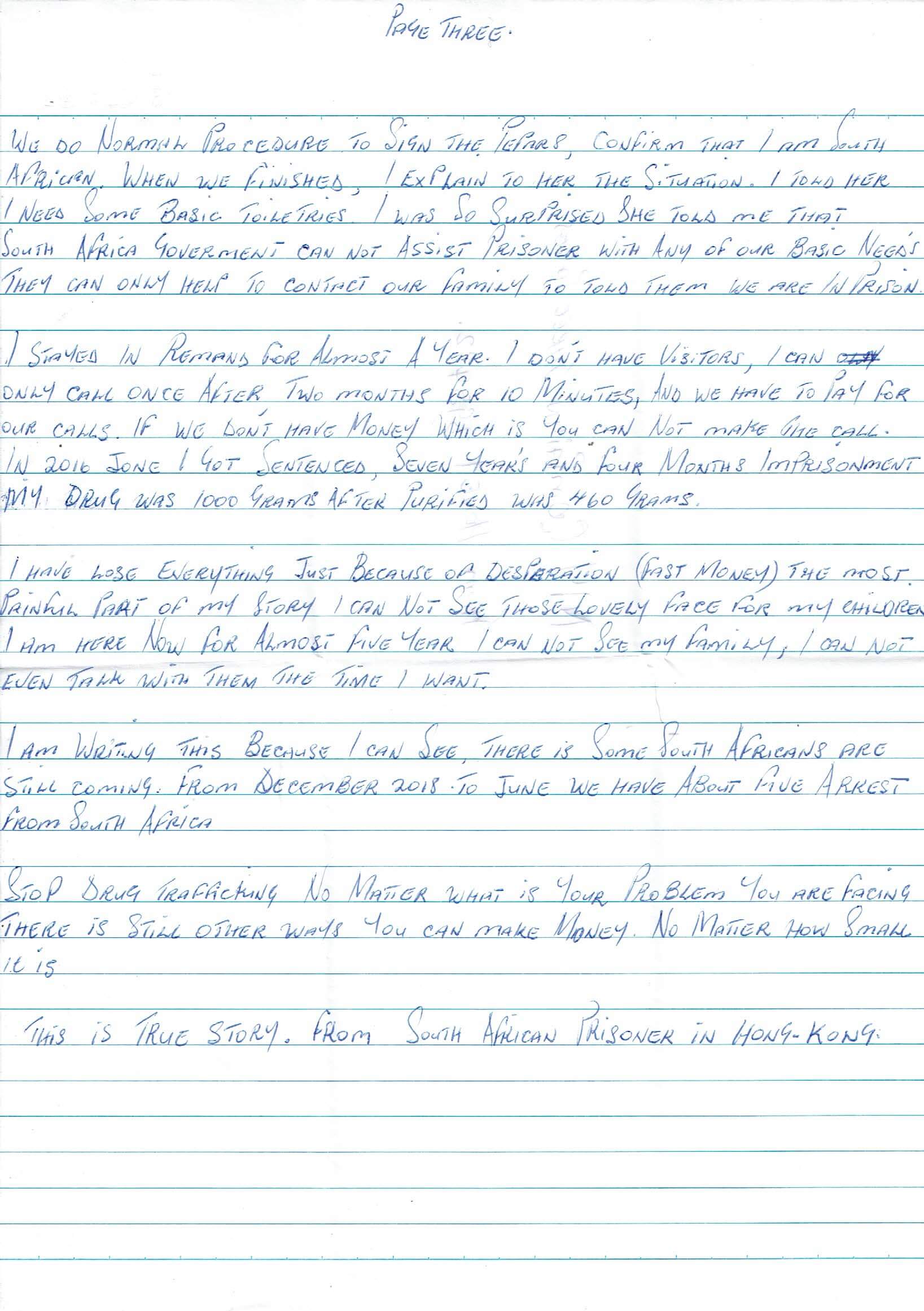 The next day I asked the welfare officer to help me call the South African Consulate with the hope that they can help me with some basic needs. A few days later I received the visit of the consul. It was the first time I had seen a black person in Hong Kong that I could speak to and be understood. I was so happy I didn’t want to let her go. I was told then that the South African Government does not assist prisoners with any of their basic needs. They can only help to contact our family to tell them we are in prison.