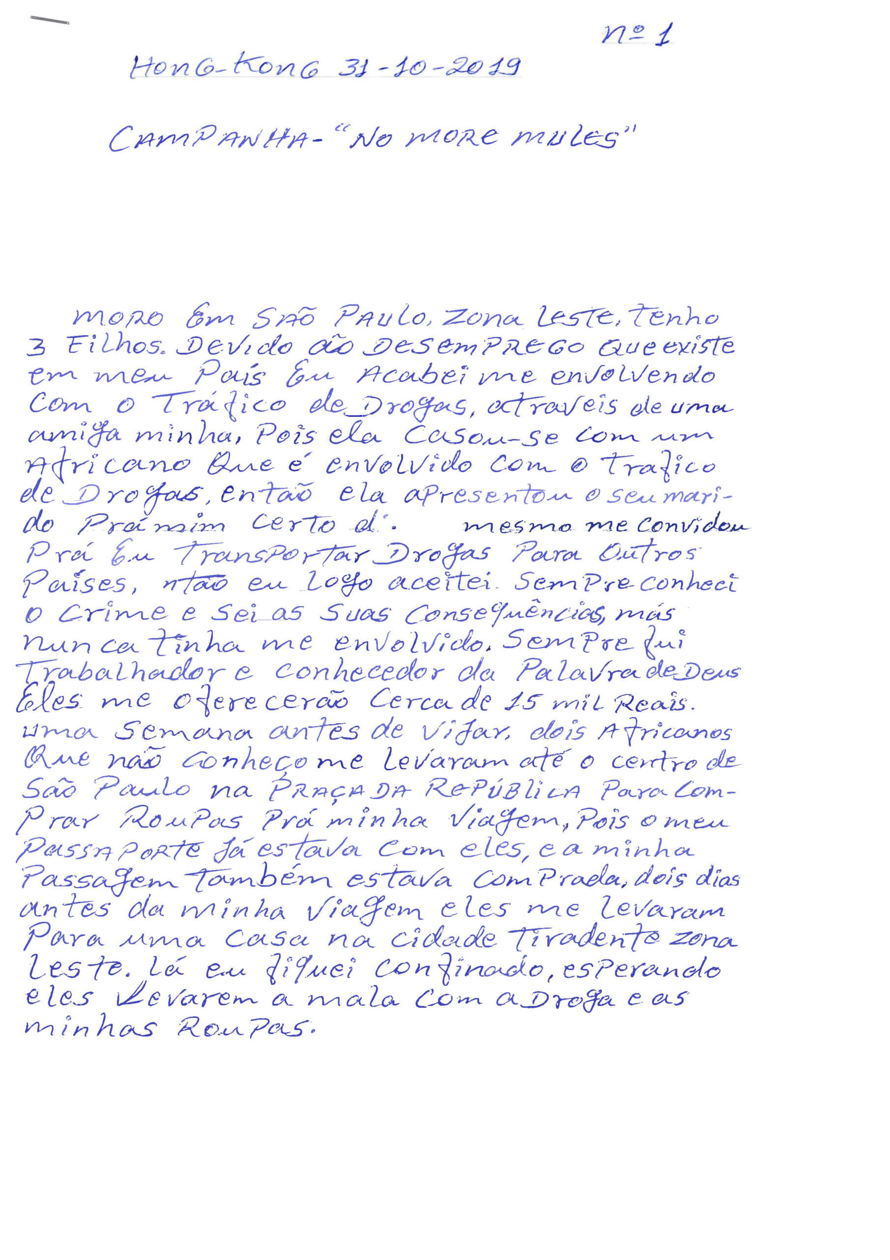 Moro em São Paulo, zona leste, tenho 3 filhos. Devido ao desemprego que existe em meu país eu acabei me envolvendo com o tráfico de drogas, através de uma amiga minha, pois ela casam-se com um africano que é envolvido com tráfico de drogas. Então ela apresentou seu marido pra mim. Certo dia o mesmo me convidou prá eu transportar drogas para outros países, então eu logo aceitei sempre conheci o crime e sei as suas consequências, mas nunca tinha me envolvido. Sempre fui trabalhador e conhecedor da palavra de Deus.