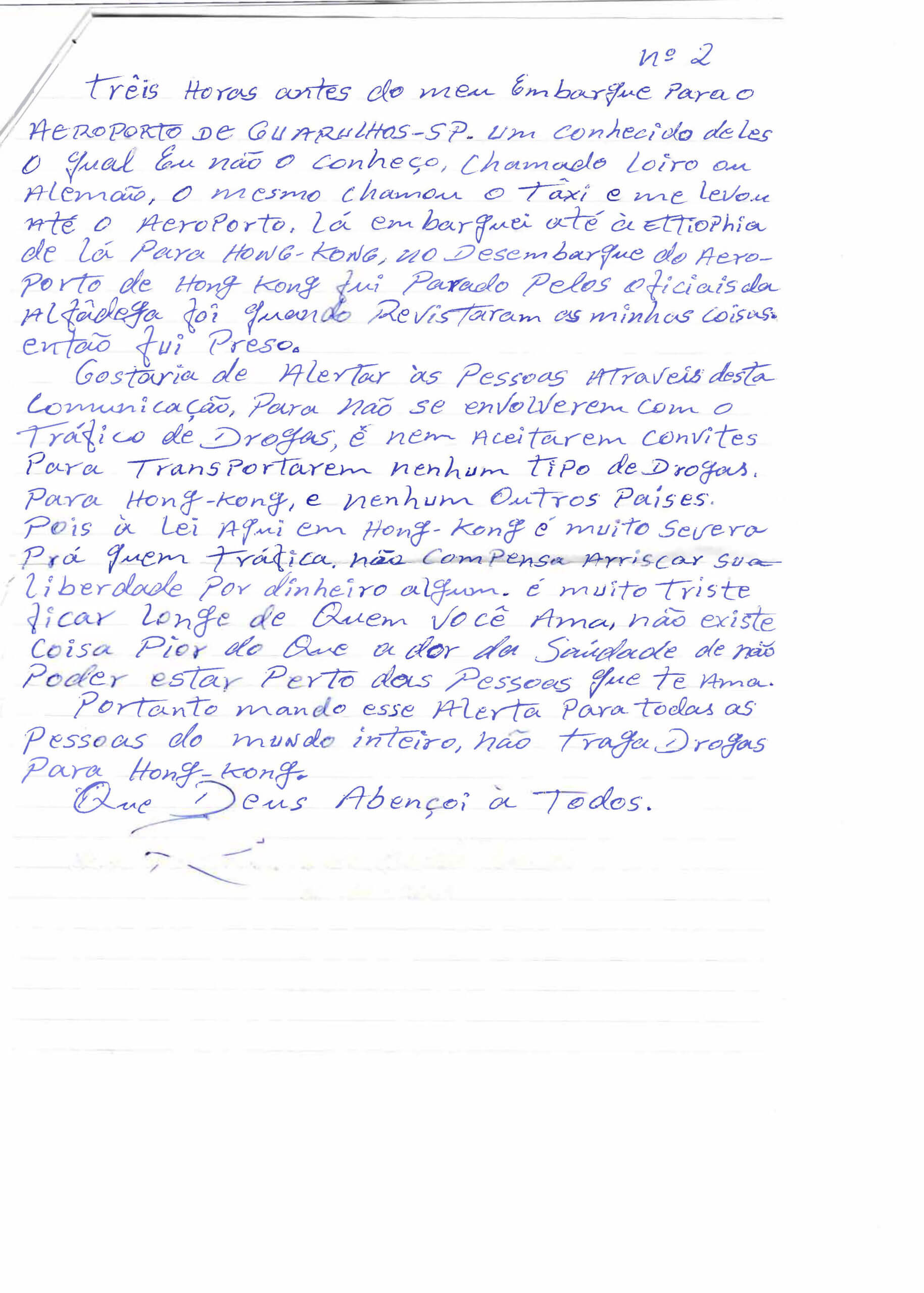 Gostaria de alertar as pessoas através desta comunicação para não se envolverem com o tráfico de drogas, e nem aceitar convites para transportarem nenhum tipo de drogas para Hong Kong, e nenhum outros países. Pois a lei aqui em hong kong e muito severa para quem trafica não compensa arriscar sua liberdade por dinheiro algum e muito triste ficar longe de quem você ama. Não existe coisa pior de que a dor da saudade de nao poder estar perto das pessoas que te ama.
