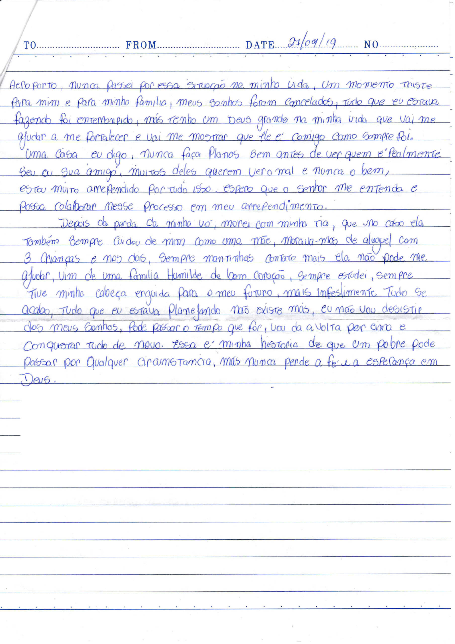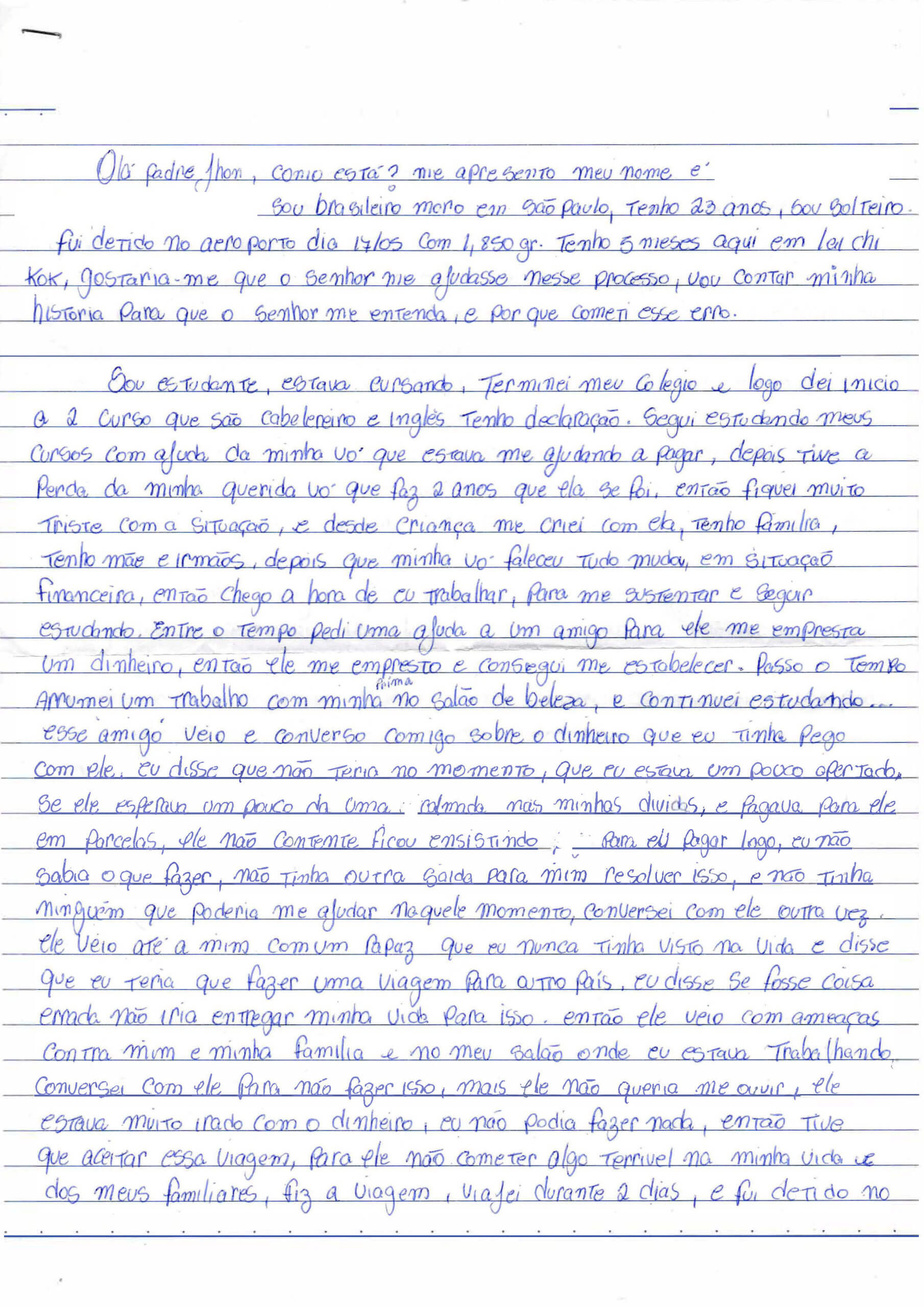 Eu disse se fosse coisa errada nao iria entregar minha vida para isso. Então ele veio com ameaças contra mim e minha família e no meu salão onde eu estava trabalhando conversei com ele para nao fazer isso, mais ele nao queria me ouvir, ele estava muito irado com o dinheiro, eu não podia fazer nada, então tive que aceitar essa viagem, para ele nao cometer algo terrível na minha vida e dos meus familiares, fiz a viagem, viajei durante 2 dias, e fui detido no Aeroporto, nunca passei por essa situação na minha vida. Um momento triste para mim e para minha família, meus sonhos foram cancelados, tudo que eu estava fazendo foi interrompido, mas tenho um Deus grande na minha vida que vai me ayudar a me fortalecer e vai me mostrar que ele e comigo como sempre foi.