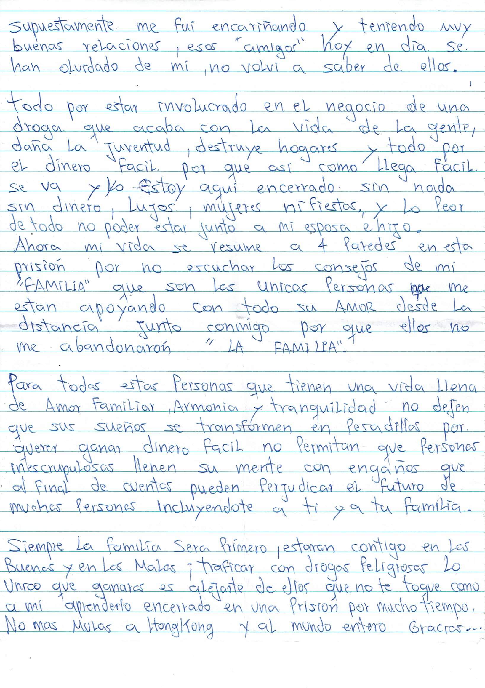 Todo por estar involucrado en el negocio de una droga que acaba con la vida de la gente, daña la juventud y destruye hogares… todo por el dinero fácil. Porque así como llega, fácil se va y hoy estoy aquí encerrado sin nada, sin dinero, lujos, mujeres, ni fiesta, y lo peor de todo es no poder estar junto a mi esposa e hijo.