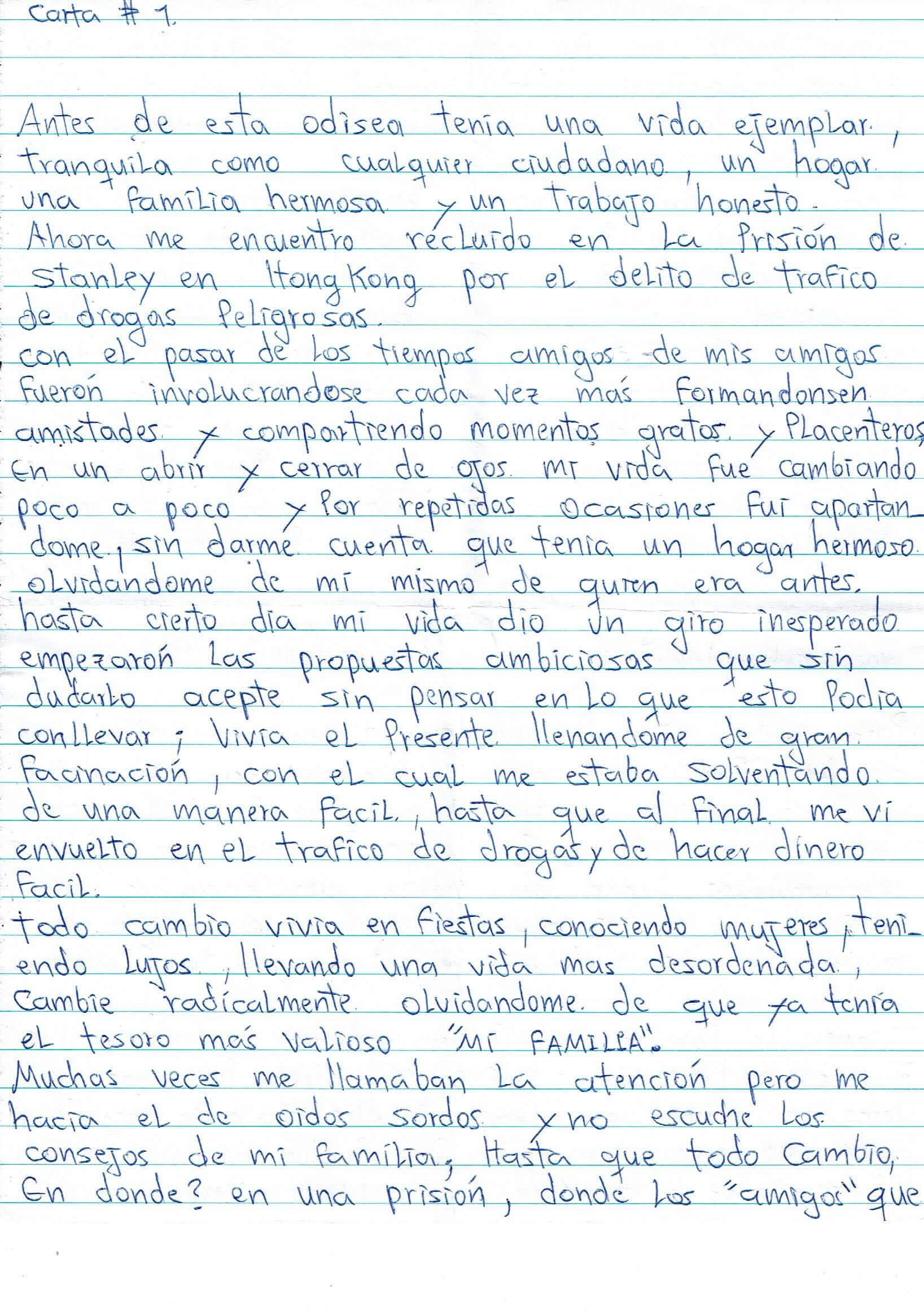 Antes de esta odisea tenía una vida ejemplar, tranquila como cualquier ciudadano, un hogar una familia hermosa y un trabajo honesto. Ahora me encuentro recluido en la prisión de Stanley en Hong Kong por el delito de tráfico de drogas peligrosas.