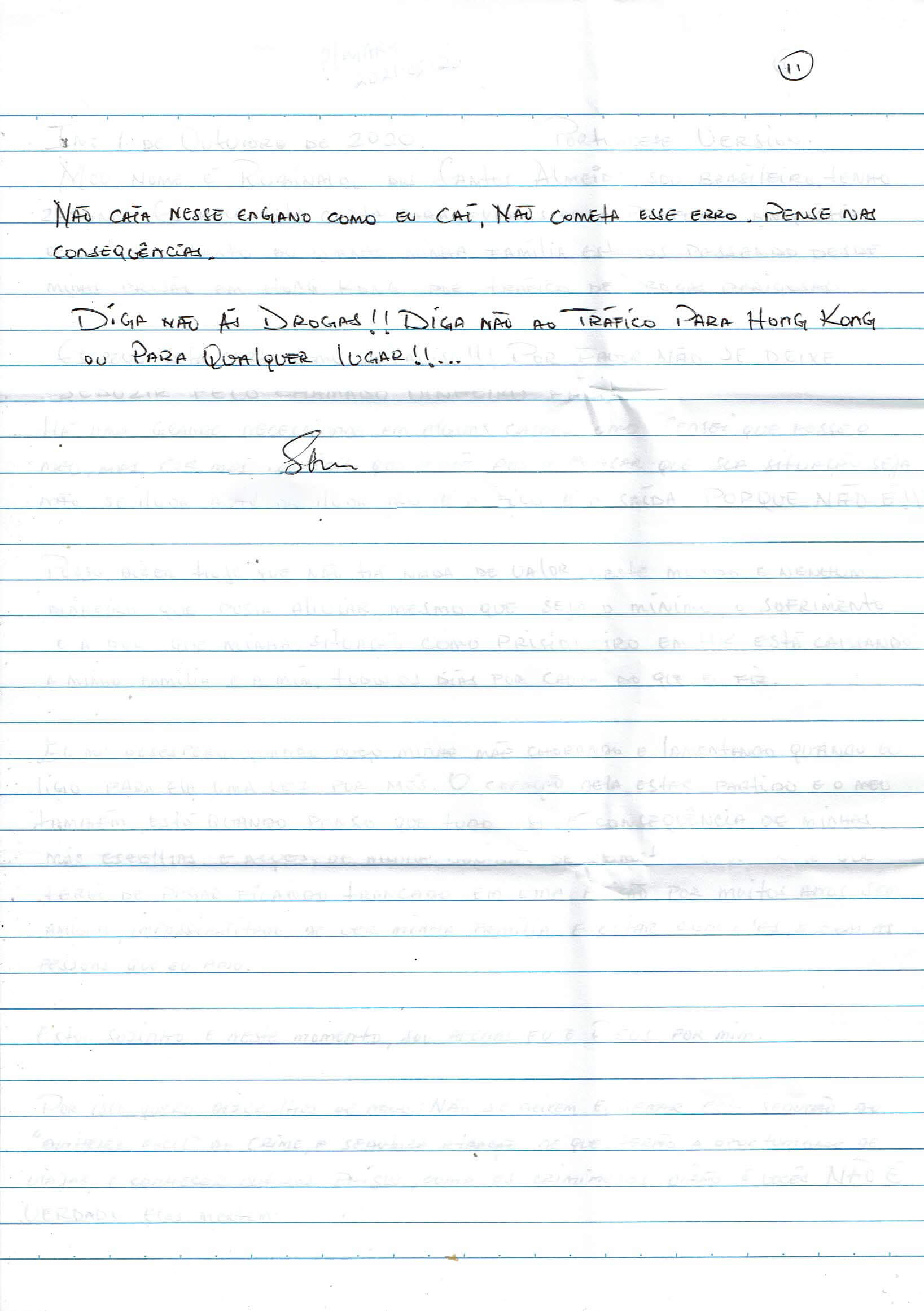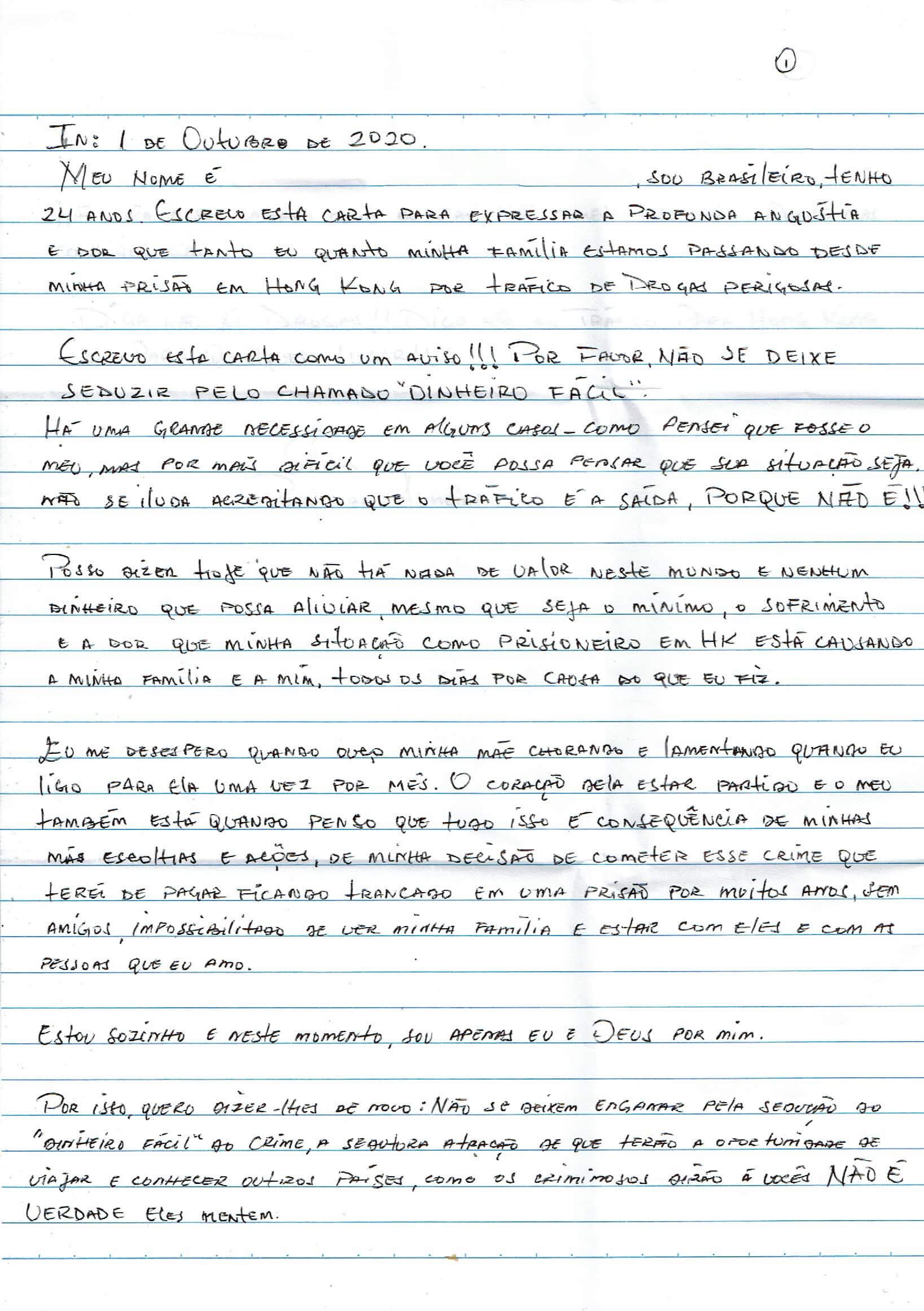 Sou brasileiro, tenho 24 anos. Escrevo esta carta para expressar a profunda angústia e dor que tanto eu quanto minha família estamos passando desde minha prisão em Hong Kong por tráfico de drogas perigosas.