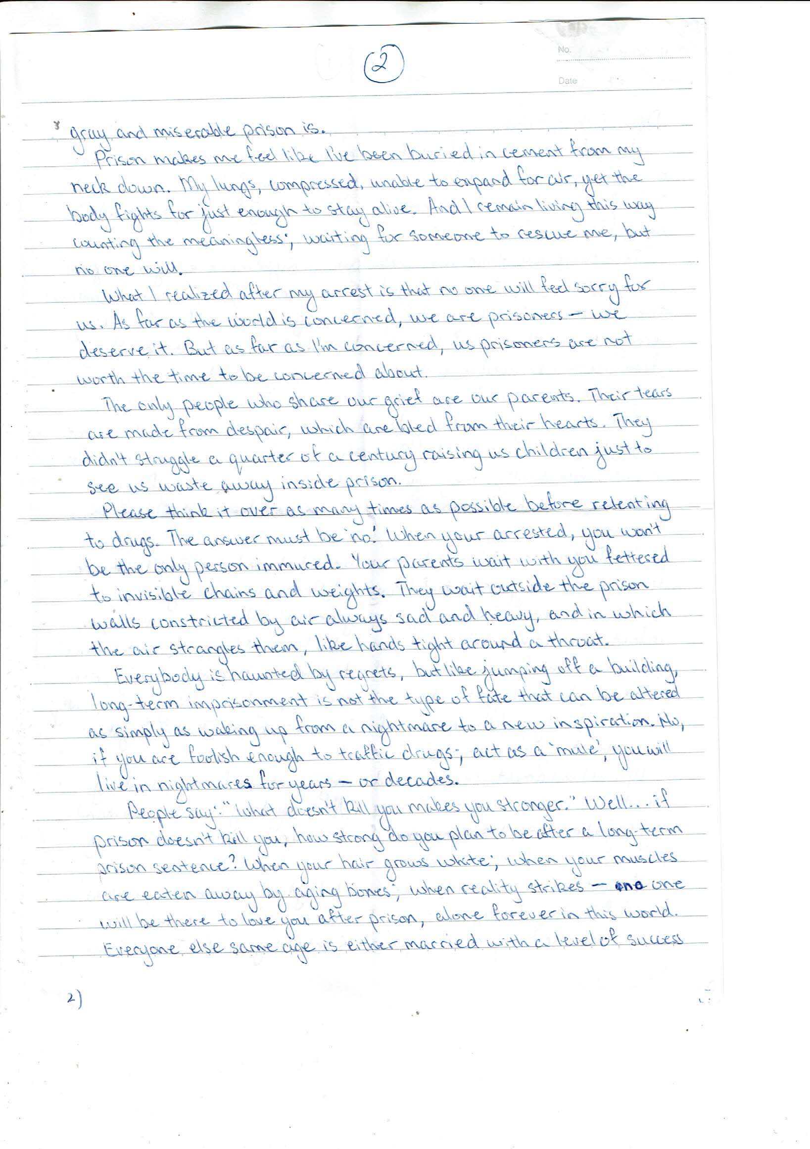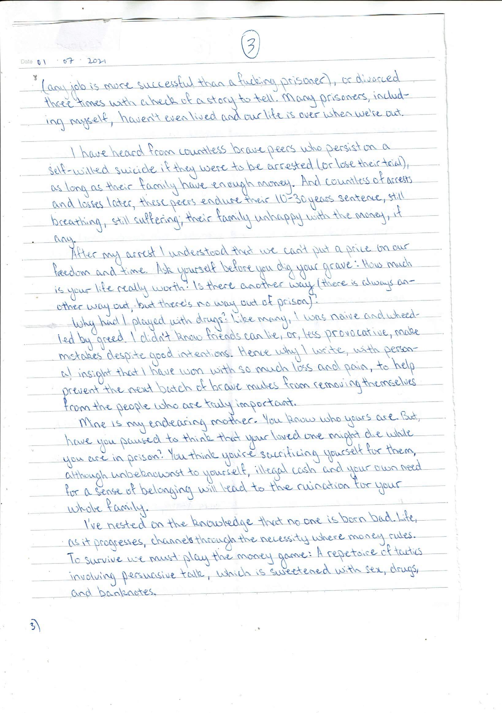 After my arrest, I understood that we can’t put a price on our freedom and time. Ask yourself before you dig your grave… How much is your life really worth? Is there another way (there is always another way out, but there is no way out of prison)?