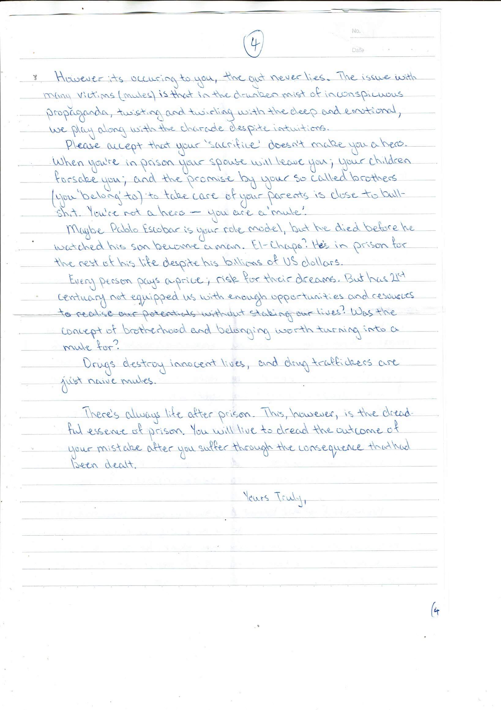Please accept that your “sacrifice” doesn’t make you a hero. When you’re in prison your spouse will leave you, your children forsake you, and the promise of your so-called brothers (you “belong“ to) to take care of your parents is merely a lie. You are not a hero – you are a “mule”.