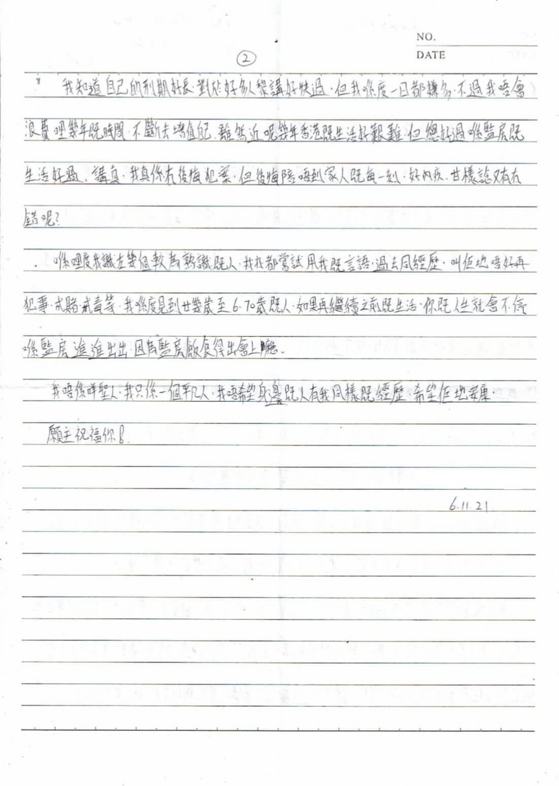 我知道自己的刑期好長,對於好多人嚟講好快過,但我喺度一日都嫌多。不過我唔會浪費呢幾年嘅時間,不斷去增值自己。雖然近呢幾年香港嘅生活好艱難,但總比喺監房嘅生活好過。講真,我真係冇後悔犯罪,但後悔陪唔到家人嘅每一刻,好內疚,咁樣諗又有冇錯呢?