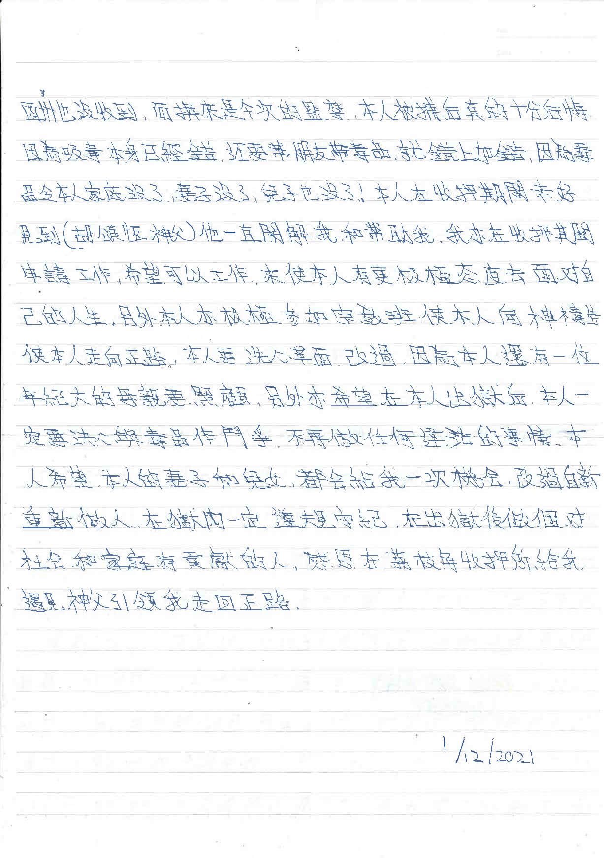 本人被捕後真的十分後悔,因為吸毒本身已經錯,還要幫朋友帶毒品,就錯上加錯,因為毒品令本人家庭沒了,妻子沒了,女兒也沒了!本人在收押期間幸好見到胡頌恆神父,他一直開解我,和幫助我。我亦在收押期間申請工作,希望可以工作,使我更有積極態度去面對自己的人生,另外本人亦積極參加宗教班,我向神禱告,使我走向正路。