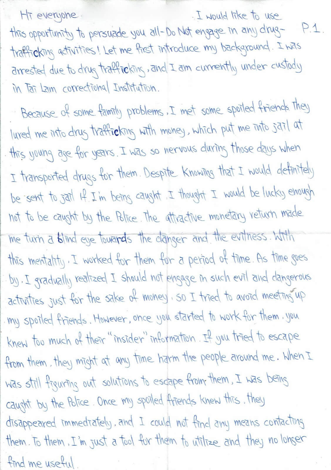 I would like to take this opportunity to persuade you all DO NOT engage in any drug trafficking activities! Let me first introduce my background. I was arrested due to drug trafficking, and I am currently under custody at Tai Lam Correctional Institution.
