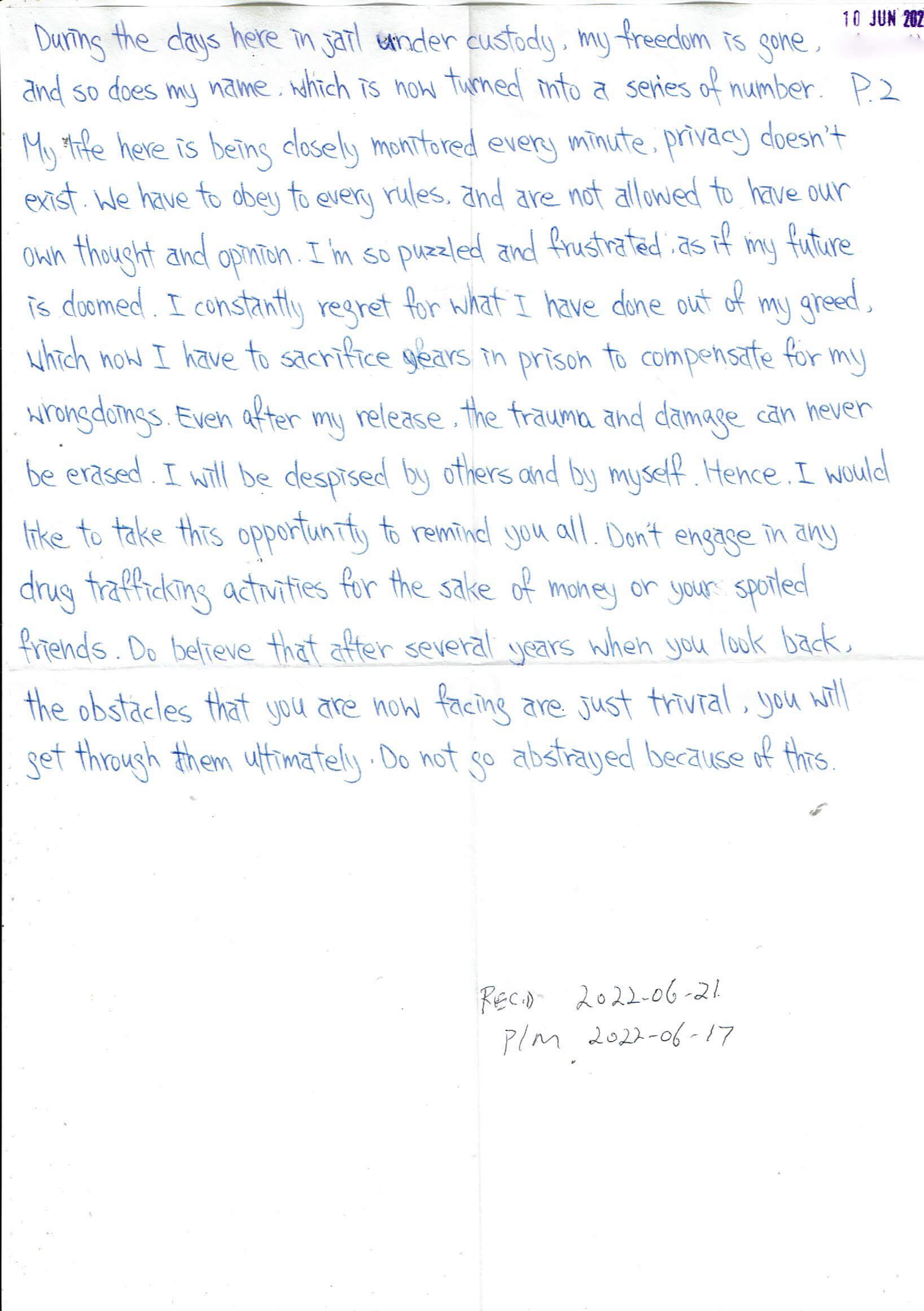 I’m so puzzled and frustrated as if my future is doomed. I constantly regret what I have done out of my greed, and now I have to sacrifice years in prison to compensate for my wrongdoings. Even after my release, the trauma and damage can never be erased. I will be despised by others and by myself. Hence, I would like to take this opportunity to remind you all. Don’t engage in any drug trafficking activities for the sake of money or peer pressure. Do believe that after several years when you look back, the obstacles that you are now facing are just trivial, you will get through them ultimately. Do not go astray because of this.
