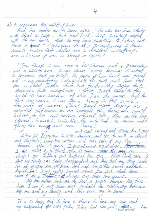 I was apprehended on charges of robbery and trafficking. My family is extremely disappointed in me. My parents take care of my 8-year-old son, but they have decided that they cannot take care of my youngest one. He is now under the care of the Social Welfare Department. I am deeply concerned about his well-being and unsure of what to do. It has been two years since I last saw them. I have been crying constantly since then.This time, my mother has helped me hire a lawyer. I hope I can go out soon and rebuild the relationship between me and my family and take care of my two sons.