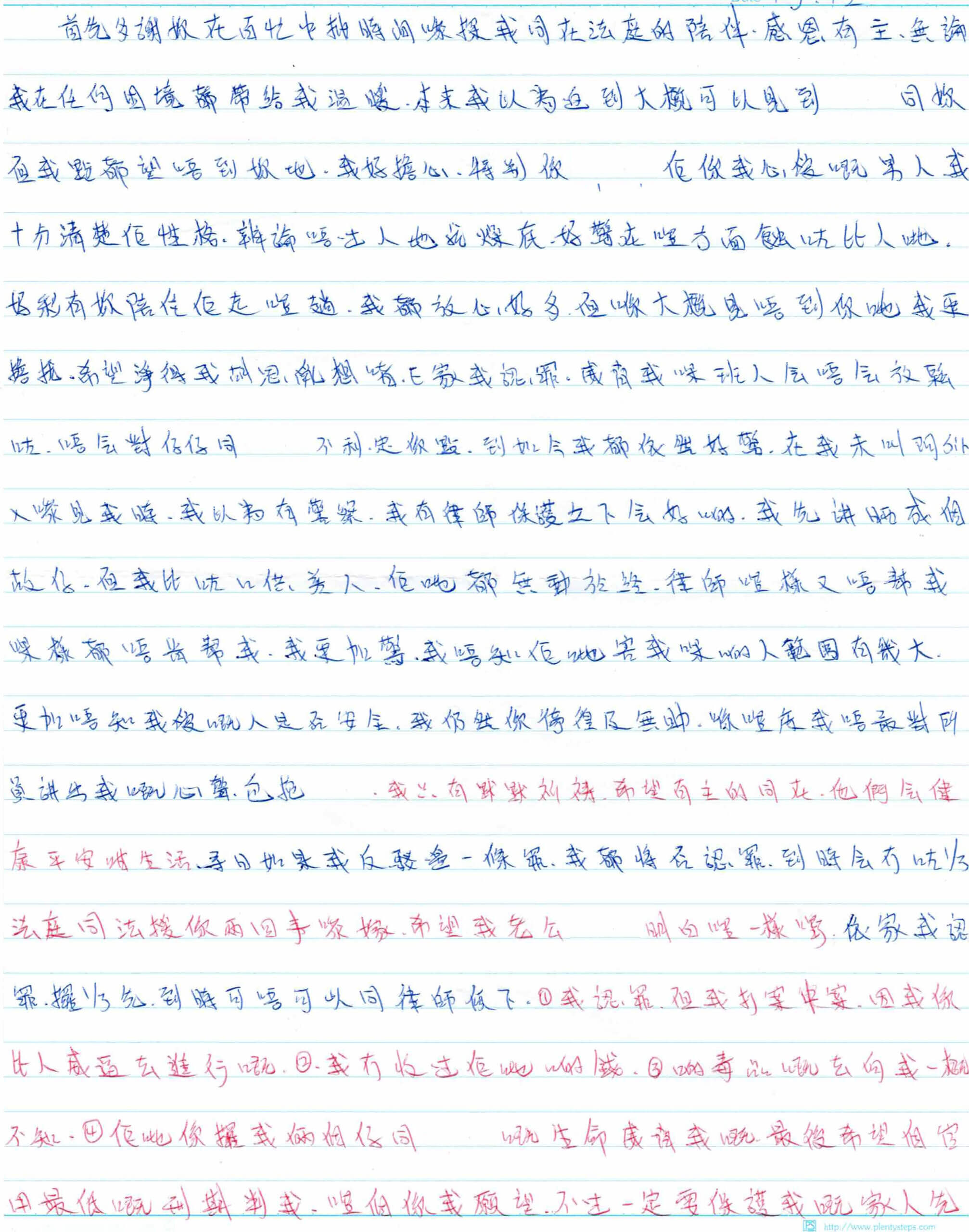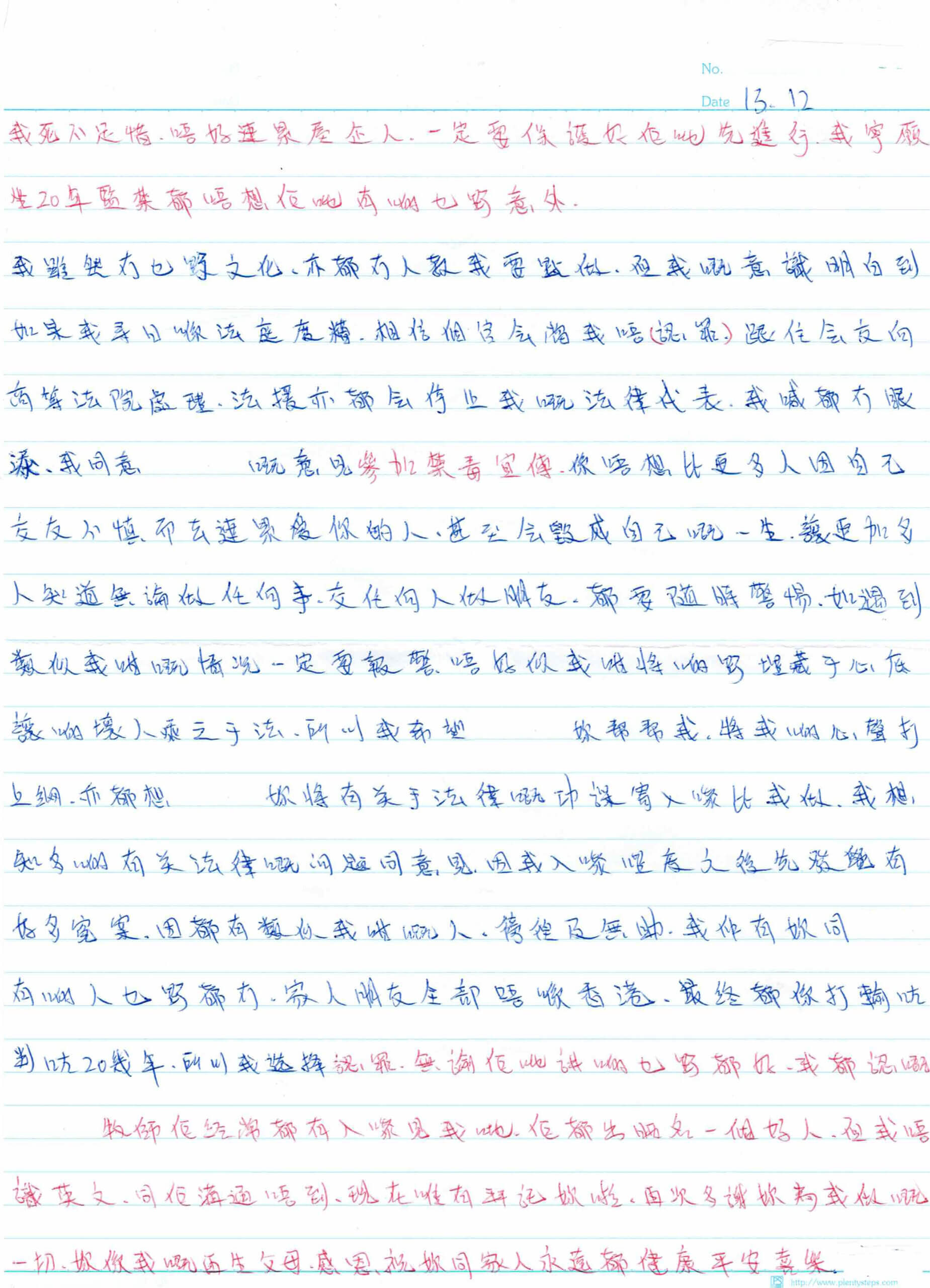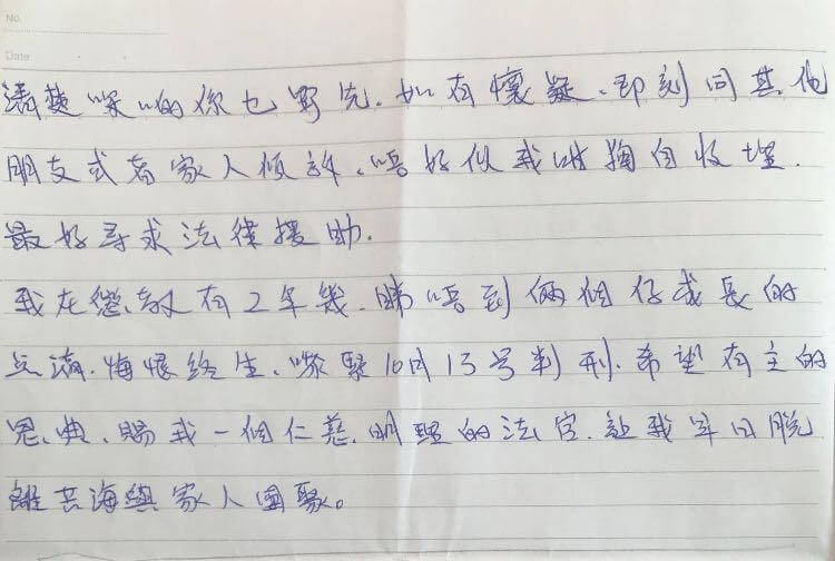 我在懲教有兩年幾,睇唔到兩個仔成長的點滴,悔恨終身。嚟緊1013號判刑,希望有主的恩典,賜我一個仁慈,名利的法官,讓我早日脫嚟苦海與家人團聚。