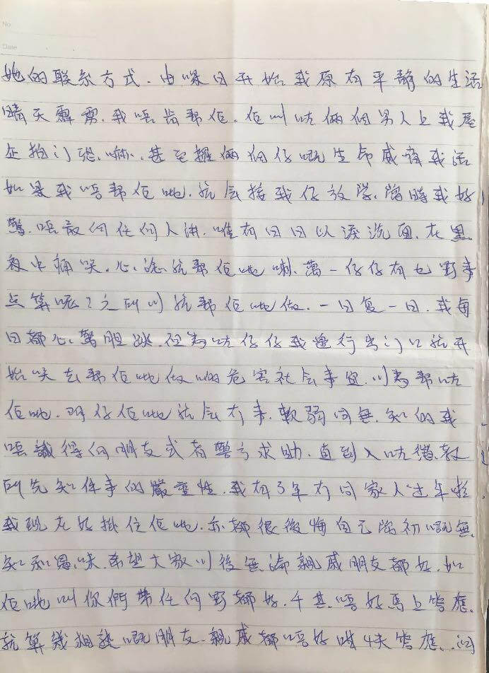 依家我認罪,威脅我嗰班人會唔會放鬆咗,唔會對仔仔同男朋友不利定係點。到如今,我都依然好驚。我唔知佢哋害我嗰啲人範圍有幾大,更加唔知我愛嘅人是否安全。我仍然係徬徨及無助,喺呢度我唔敢對所有人員講出我嘅心聲,包括男朋友。我只有默默祈禱,希望有主的同在,他們會健康平安咁生活。