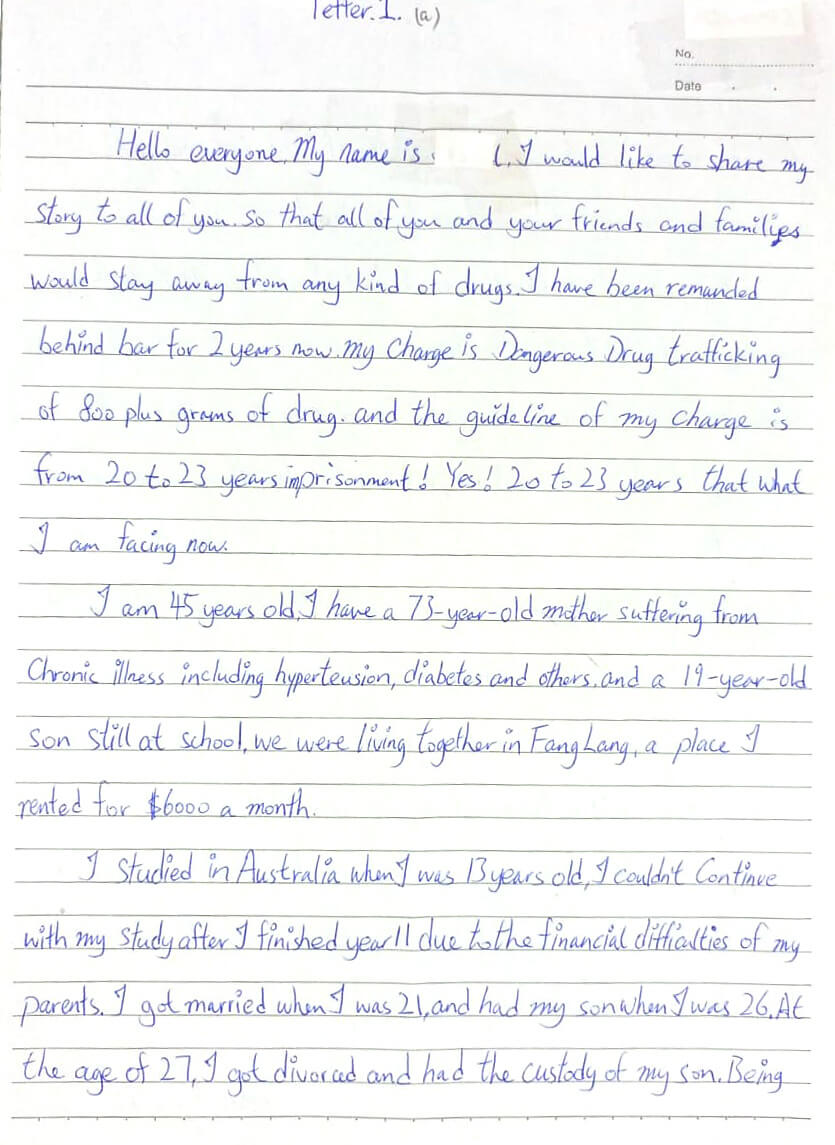 Hello everyone, I’m sharing my story to urge you and your loved ones to steer clear of drugs. I’ve been in prison for two years on charges of dangerous drugs trafficking, specifically over 800+ grams. The sentence for this charge ranges from 20 to 23 years. That’s what I’m facing.