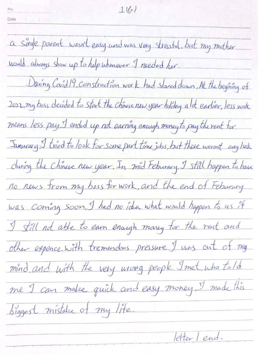 During the COVID-19 pandemic, construction work slowed down, and my boss decided to start the Chinese New Year holiday early in 2022. Less work meant less pay. I couldn’t cover January’s rent and had no luck finding part-time work. As the Chinese New Year approached in mid-February, there was still no news of work from my boss, and I didn’t know how we would cover rent and other expenses. Under enormous pressure and with the wrong influences, I made the biggest mistake of my life for quick, easy money.