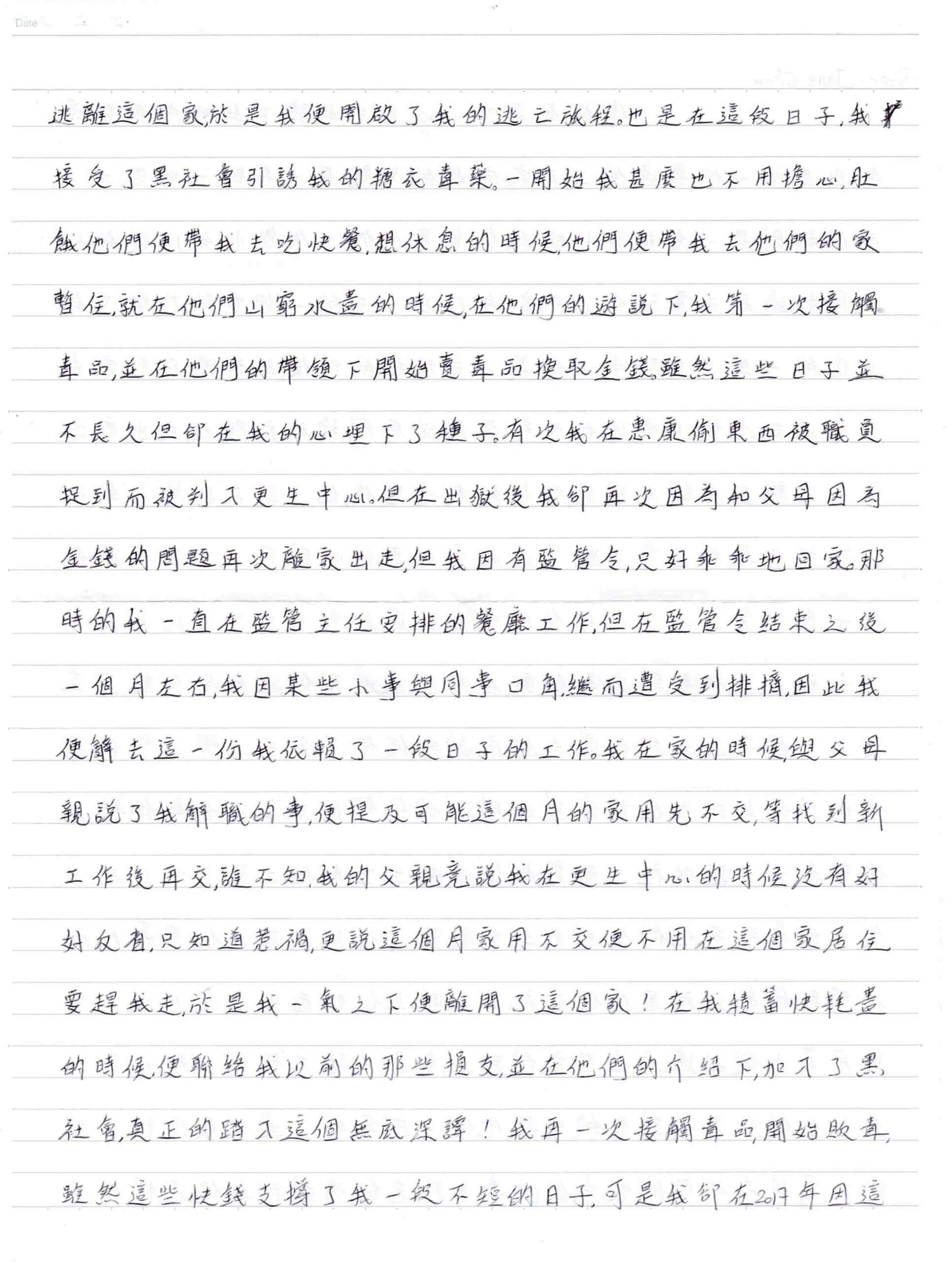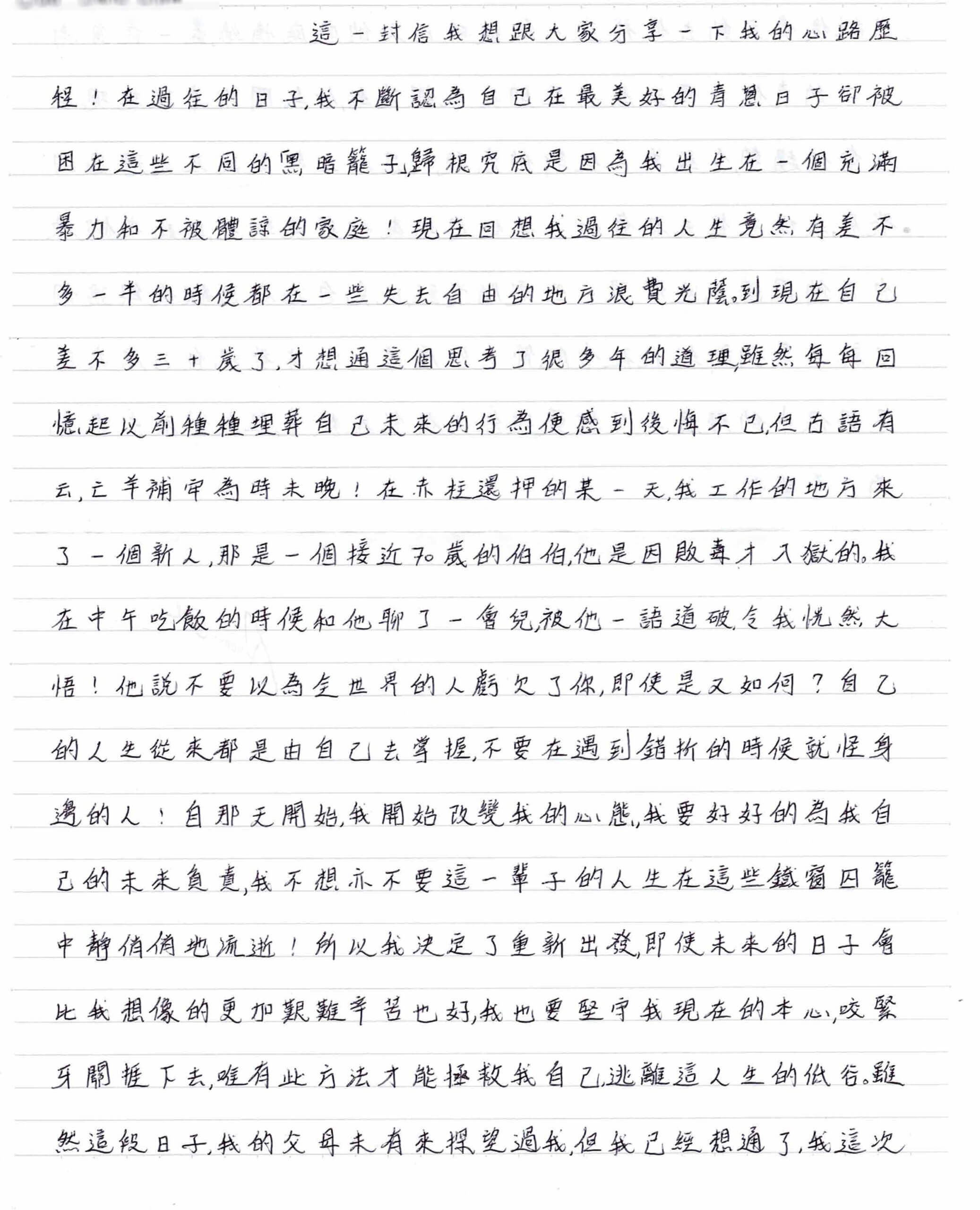 這一封信我想跟大家分享一下我的心路歷程!在過往的日子,我不斷認為自己在最美好的青蔥日子,卻被困在這些不同的「黑暗籠子」,歸根究底是因為我出生在一個充滿暴力和不被體諒的家庭!現在回想我過往的人生竟然有差不多一半的時間都在一些失去自由的地方浪費光陰。