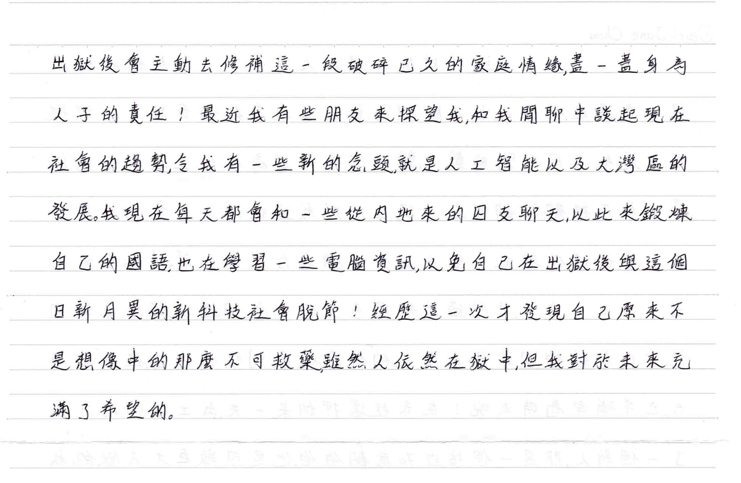 在赤柱還柙的某一天,我工作的地方來了一個新人,那是一個接近70歲的伯伯,他是因販毒才入獄的。我在中午吃飯的時候和他聊了一會兒,被他一語道破,令我恍然大悟!他說不要以為全世界的人虧欠了你,即使是又如何?自己的人生從來都是由自己去掌握,不要再遇到挫折的時候就怪身邊的人!自那天開始,我開始改變我的心態,我要好好的為我自己的未來負責,我不想亦不要這一輩子的人生在這些鐵窗囚籠中靜悄悄地流逝!