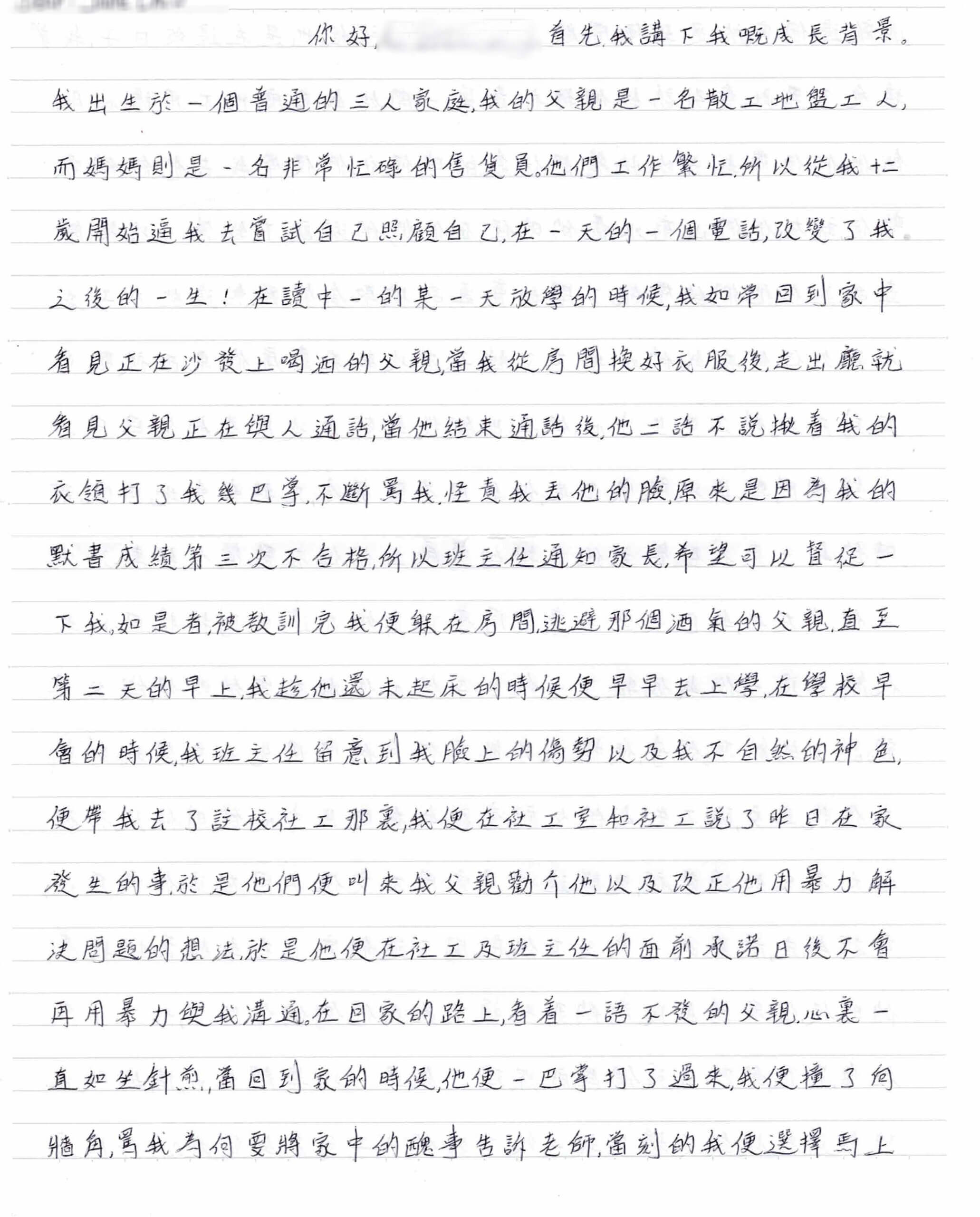 在讀中一的某一天放學的時候,我如常回到家中,看見正在沙發上喝酒的父親。當我從房間換好衣服後,走出廳,就看見父親正在與人通話。當他結束通話後,便二話不說揪着我的衣領打了我幾巴掌,不斷罵我,怪責我丟他的臉。原來是因為我的默書成績第三次不合格,所以班主任通知家長,希望可以督促一下我。如是者,被教訓完我便躲在房間,逃避那個酒氣的父親。