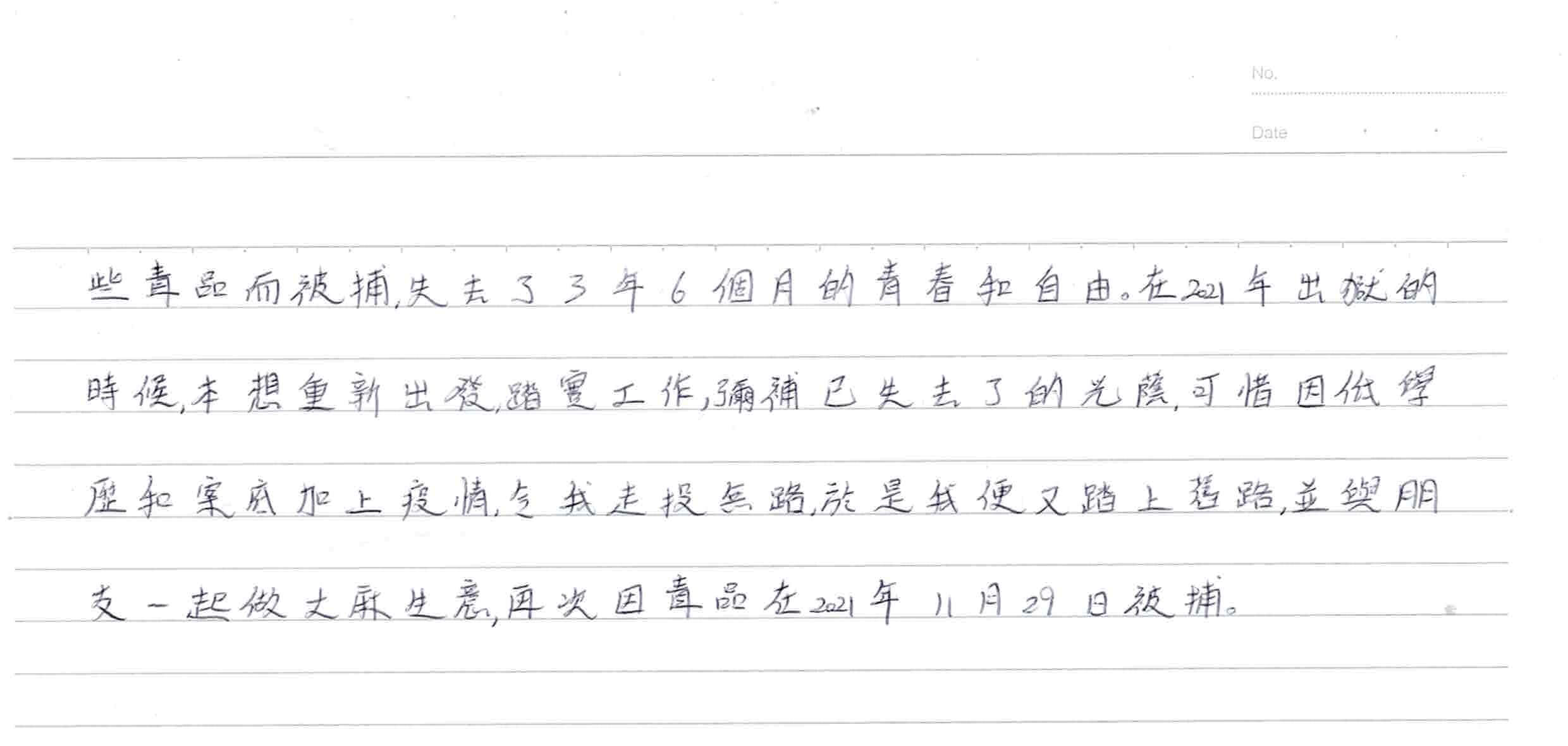 2021年出獄的時候,本想重新出發,踏實工作,彌補已失去了的光陰。可惜因低學歷和案底加上疫情,令我走投無路,於是我便又踏上舊路,並與朋友一起做大麻生意,再次因毒品在20211129日被捕。