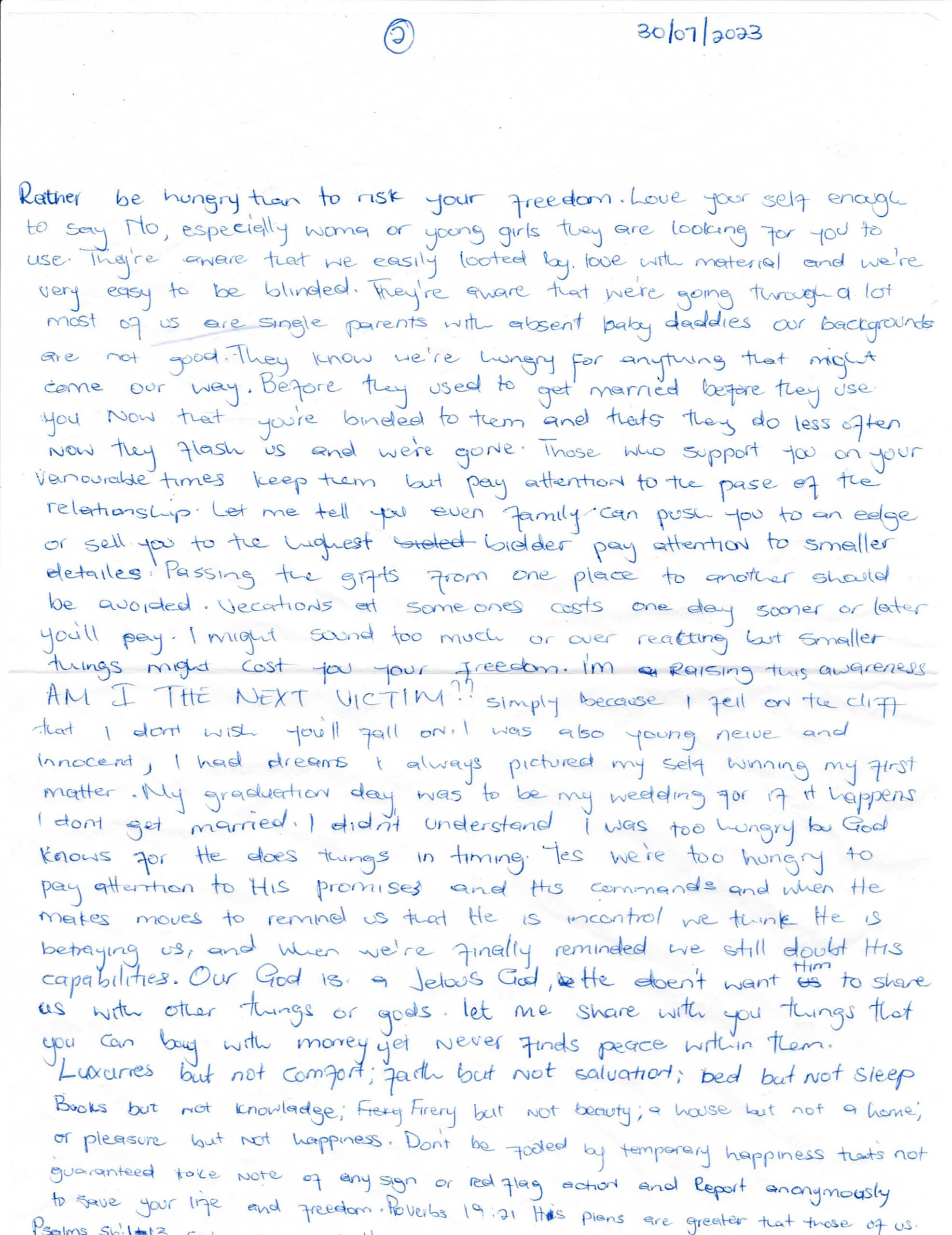 Rather be hungry than to risk your freedom. Love yourself enough to say No, especially women or young girls. These people are looking for you to use. They’re aware that we are easily lured by loved ones with material things and we’re very easily blinded. They’re aware that we’re going through a lot. Most of us are single mothers with small children. Our backgrounds are troubled. They know we’re hungry for anything that might come our way.
