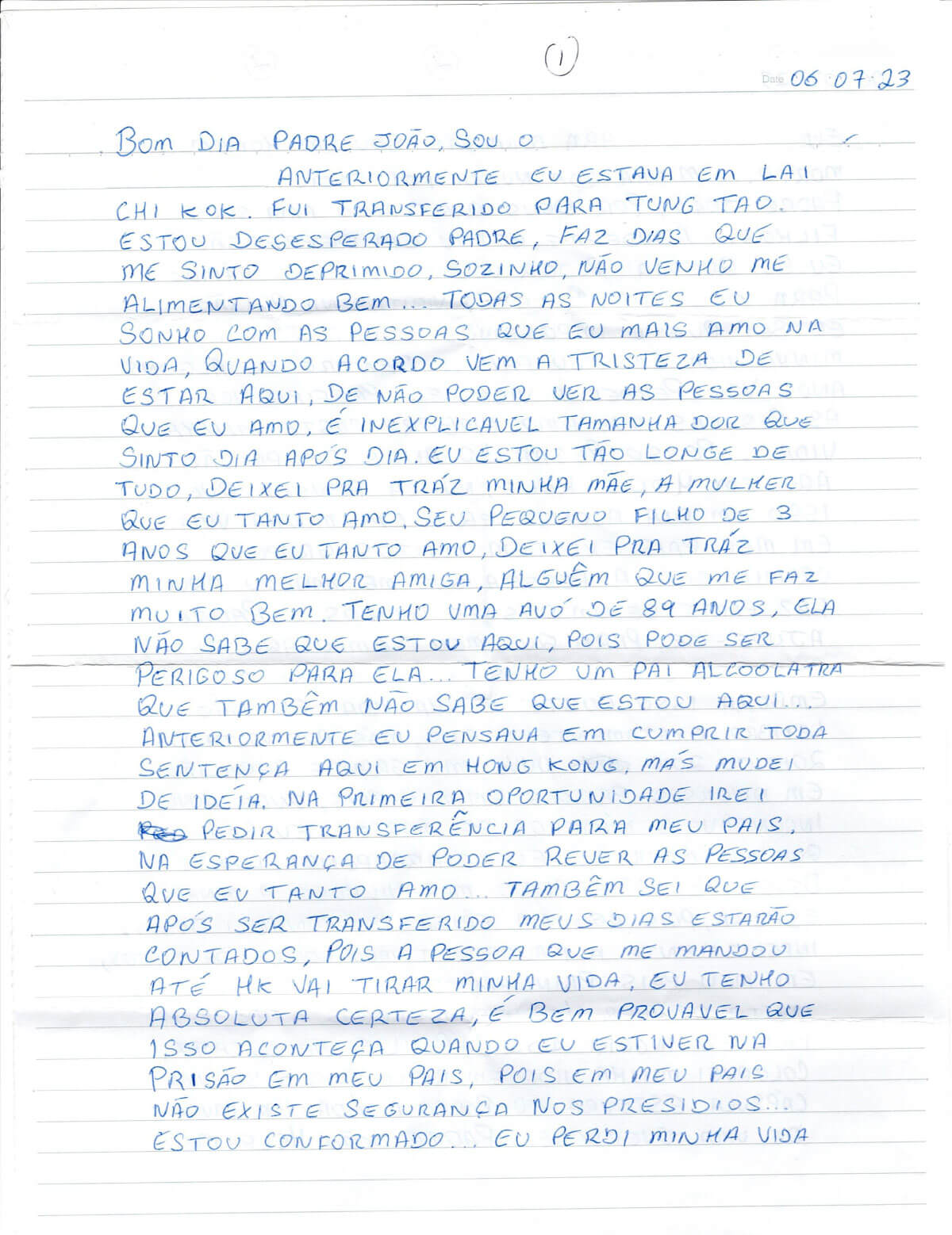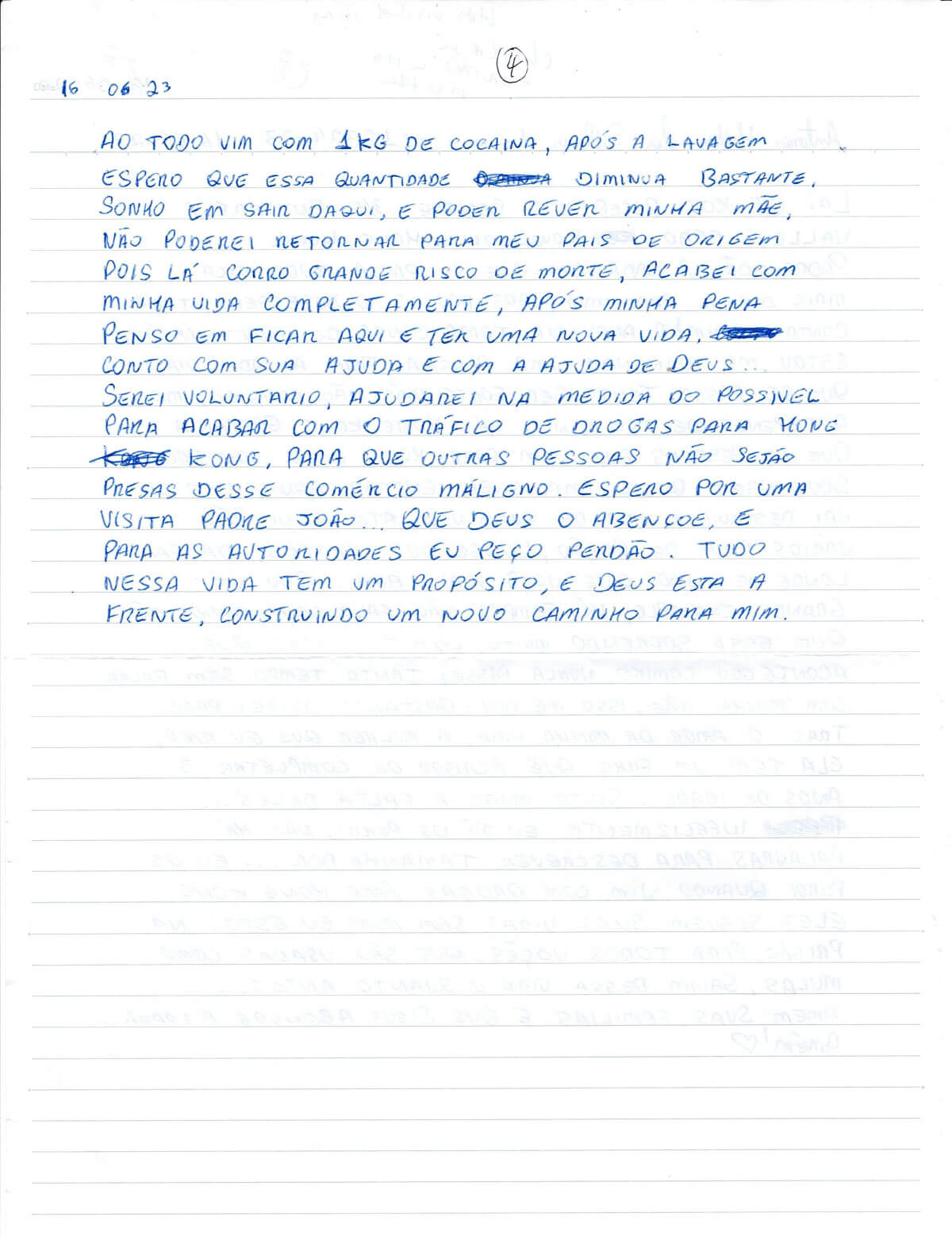 Anteriormente eu pensava em cumprir toda sentença que em Hong Kong, mas mudei de ideia. Na primeira oportunidade irei pedir transferência para meu país. Na esperança de poder rever as pessoas que eu tanto amo… também sei que por ser transferido meus dias estarão contados, pois a pessoa que me mandou até Hong Kong vai tirar minha vida. Eu tenho absoluta certeza é bem provável que isso aconteça quando eu estiver na prisão em meu país, pois em meu país não existe segurança nos presídios… Estou conformado… Eu perdi minha vida, eu perdi minhas esperanças, sou um homem morto… Minha vida nunca foi fácil…