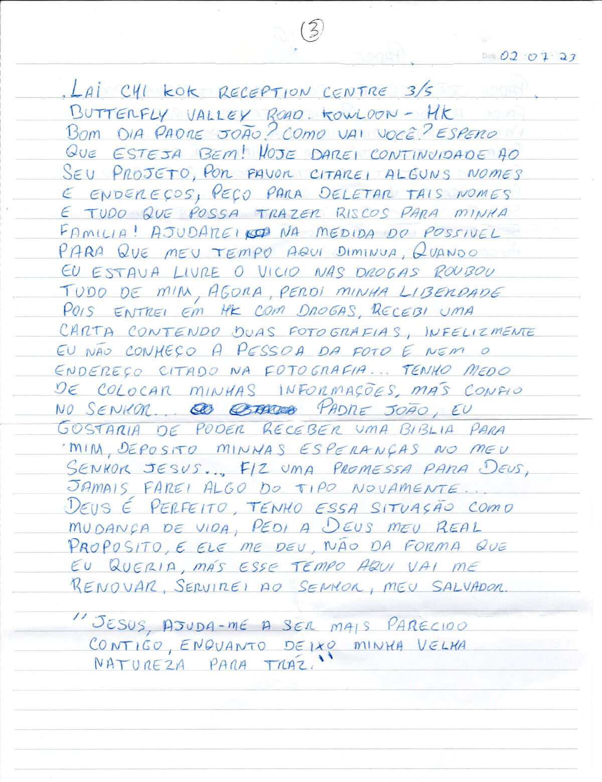 Posso pegar 10 anos de prisão aqui em Hong Kong, nunca pensei que isso um dia aconteceria em minha vida. Em meu país existem muitos grupos criminosos, a pessoa que me mandou aqui faz parte de um desses grupos… Eu quero que meu tempo aqui seja curto e que eu possa voltar para o meu país, embora isso custa minha vida. Eu não lembro exatamente o ano, más por volta de 2015 ou 2016 houve uma grande rebelião em diversas prisões em meu país, onde houve incontáveis números de mortes. Eu sei que vou morrer… Eu me arrependi diante Deus… Existe algo maravilhoso a minha espera, pois aqui na prisão eu conheci Jesus.