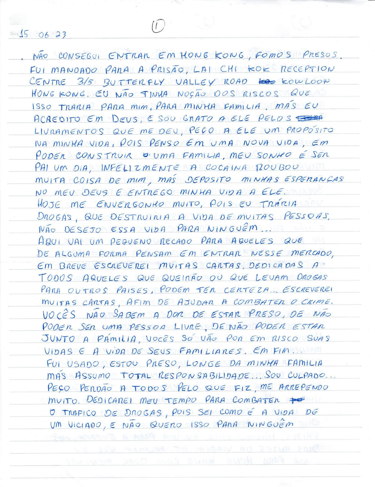 Eu estava totalmente tomado pelo vício… a cocaína muda a minha forma de agir, de pensar, minhas atitudes… Eu me arrependo amargamente de ter vindo a Hong Kong com drogas, dessa vez eu perdi minha vida. Meu convívio com minha família. Eu estou há pouco mais de um mês na cadeia, hoje livre do vício, posso ter noção do tamanho do erro que cometi, do risco que tive quando vim há Hong Kong…