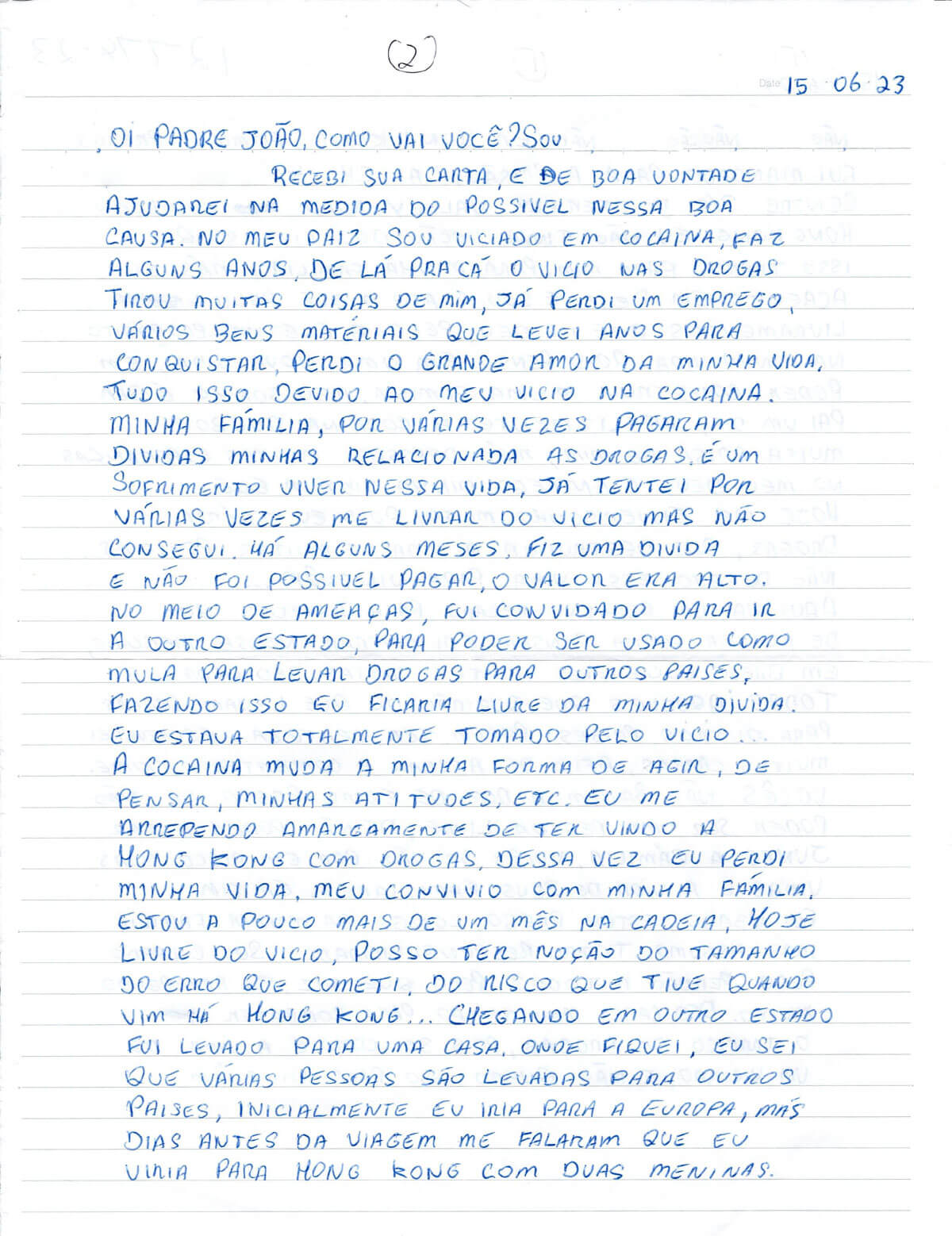 Chegando em outro estado fui levado para uma casa onde fiquei. Eu sei que várias pessoas são levadas para outras países, inicialmente eu iria para Europa, mas dias antes da viagem me falaram que eu viria para Hong Kong com duas meninas. Não consegui entrar em Hong Kong, fomos presos. Fui mandado para a prisão. Eu não tinha noção dos riscos que isso traria para mim, para minha família. Mas eu acredito em Deus, eu sou grato a ele pelos livramentos que me deu, peço a ele um propósito na minha vida pois penso em uma nova vida, em poder construir uma família, meu sonho é ser pai um dia. Infelizmente a cocaína roubou muita coisa de mim, mas deposito minhas esperanças no meu Deus e entrego minha vida a ele.