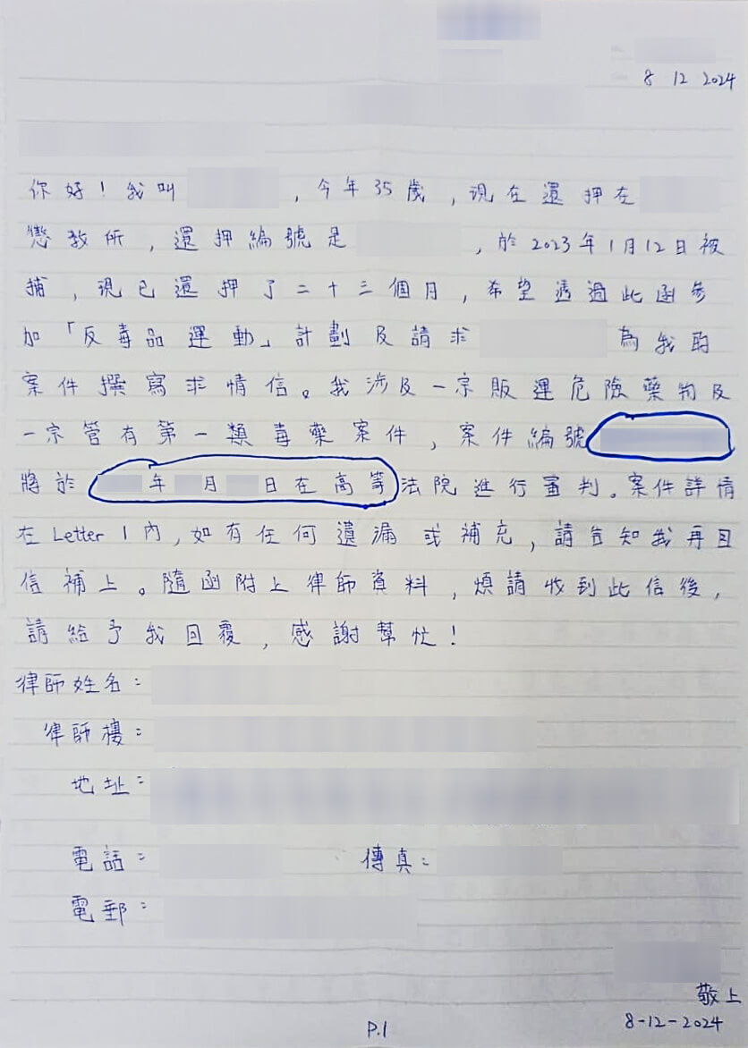 你好!我今年35歲,現在還柙中,於2023年被捕,現已還柙了23個月,希望透過此函參加「反毒品運動」計劃及為我的案件撰寫求情信。我涉及一宗販運危險藥物及一宗管有第一類毒藥案件。