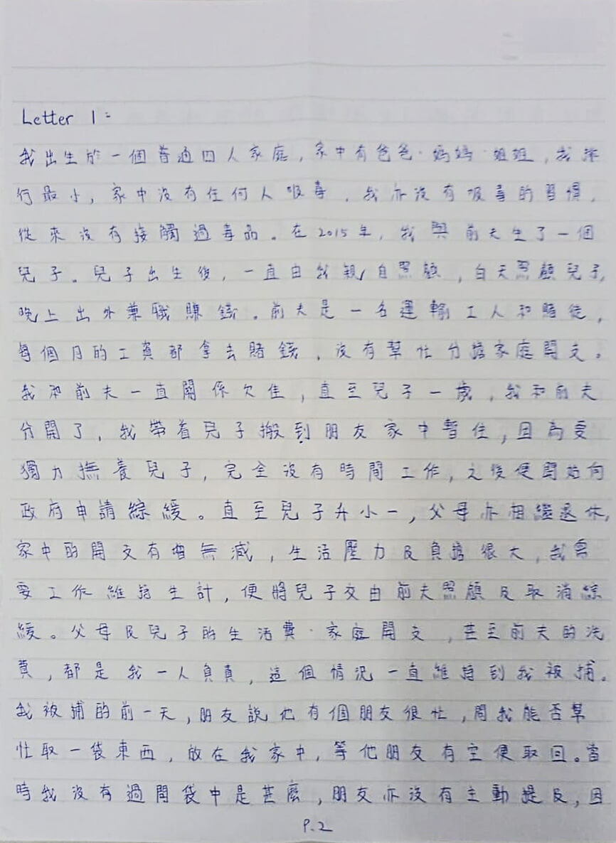 直至兒子一歲,我和前夫分開了,我帶着兒子搬到朋友家中暫住,因為要獨力撫養兒子,完全沒有時間工作。之後便開始向政府申請綜緩。直至兒子升小一,父母亦相繼退休,家中的開支有增無減,生活壓力及負擔很大,我需要工作維持生計,便將兒子交由前夫照顧及取消綜緩。父母及兒子的生活費,家庭開支,甚至前夫的洗(使) 費,都是我一人負責,這個情況一直維持到我被捕。