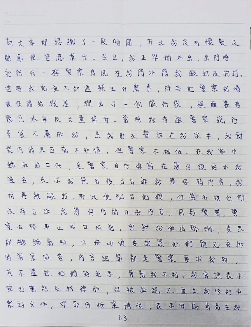 翌日,我正準備外出。出門時,突然有一群警察出現在我門外,將我毆打及拘捕。當時我完全不知道發生什麼事,待其他警察到場後便開始搜屋,搜出了一個旅行袋,裏面裝有幾包冰毒及大量偉哥。當時我有跟警察說行 李袋不屬於我,是我朋友暫放在我家中,我對袋內的東西毫不知情,但警察不相信。