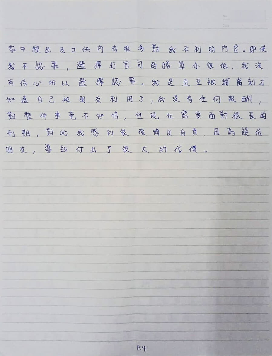 我是直至被捕當刻才知道自己被朋友利用了。我沒有任何報酬,對整件事毫不知情。但現在需要面對很長的刑期,對此我感到很後悔及自責,因為誤信朋友,導致付出了很大的代價。