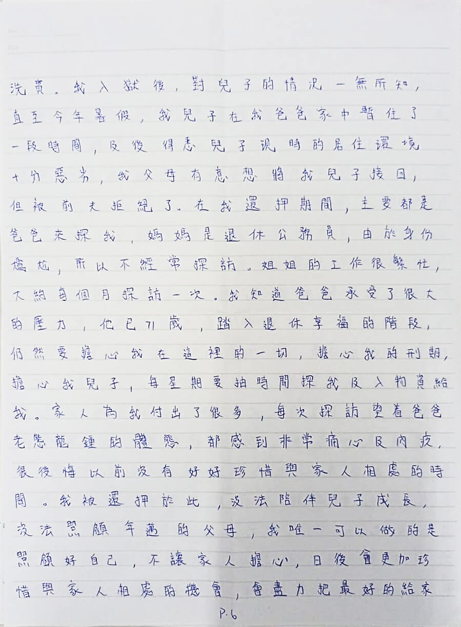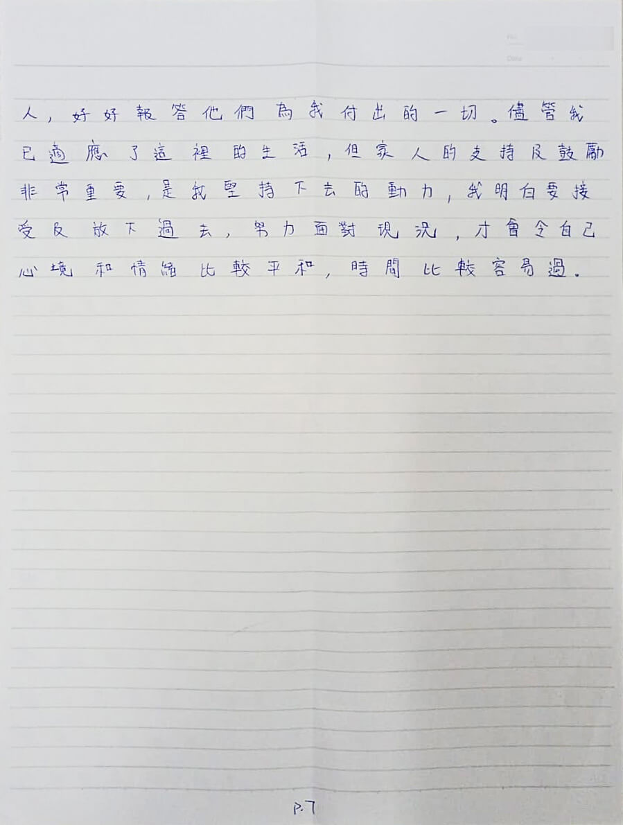 家人為我付出了很多,每次探訪望着爸爸老態龍鍾的體態,都感到非常痛心及內疚,很後悔以前沒有好好珍惜與家人相處的時間。我被還柙於此,没法陪伴兒子成長,沒法照顧年邁的父母,我唯一可以做的是照顧好自己,不讓家人擔心,日後會更加珍惜與家人相處的機會,會盡力把最好的給家人,好好報答他們為我付出的一切。