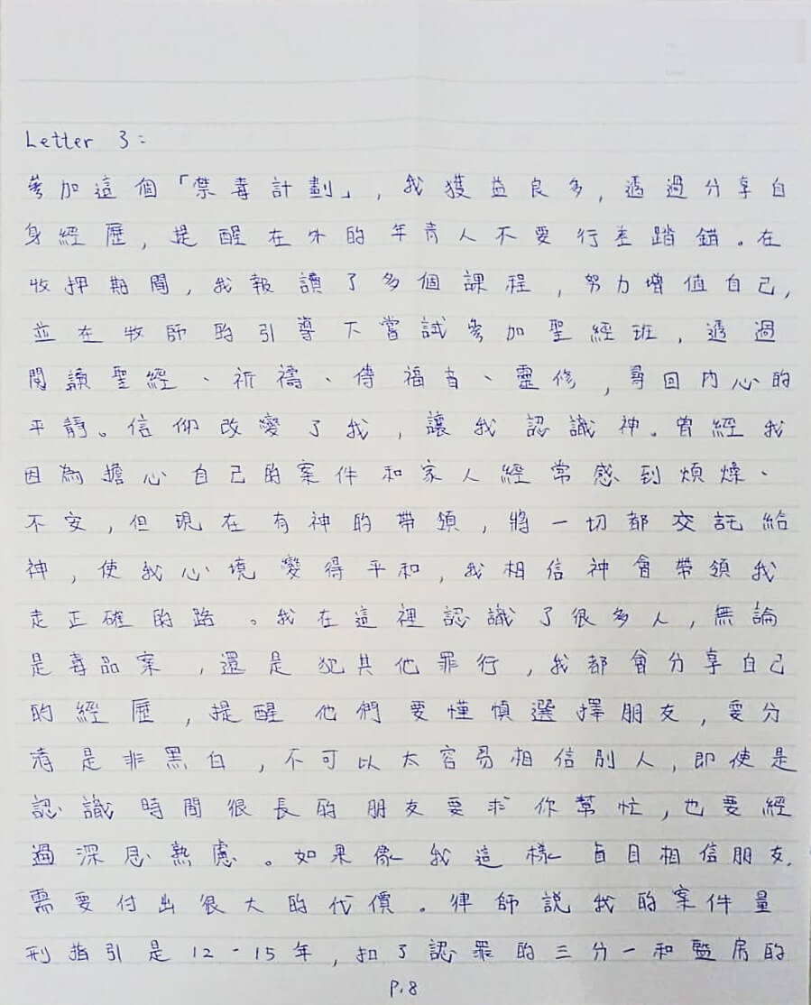 參加這個「禁毒計劃」,我獲益良多,透過分享自身經歷,提醒在外的年青人不要行差踏錯。在收柙期間,我報讀了多個課程,努力增值自己,並在牧師的引導下嘗試參加聖經班,透過閱讀聖經、祈禱、傳福音、靈修,尋回內心的平靜。信仰改變了我,讓我認識神。