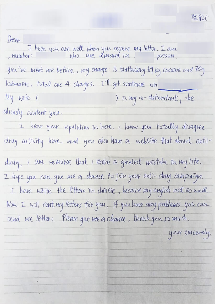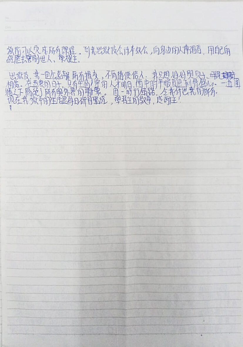 出獄後,我一定會遠離所有損友,不再随便信人。我只想好好與兒子、母親相處。在這裏的日子,只有坐過牢的人才明白箇中的辛酸,真是刻骨銘心,一道圍牆之下隔絕了所有與外界的聯繫。因一時行錯路,令我付出我的所有。現在我獄中的生活是每日研習聖經,學習主的教導,感謝主!