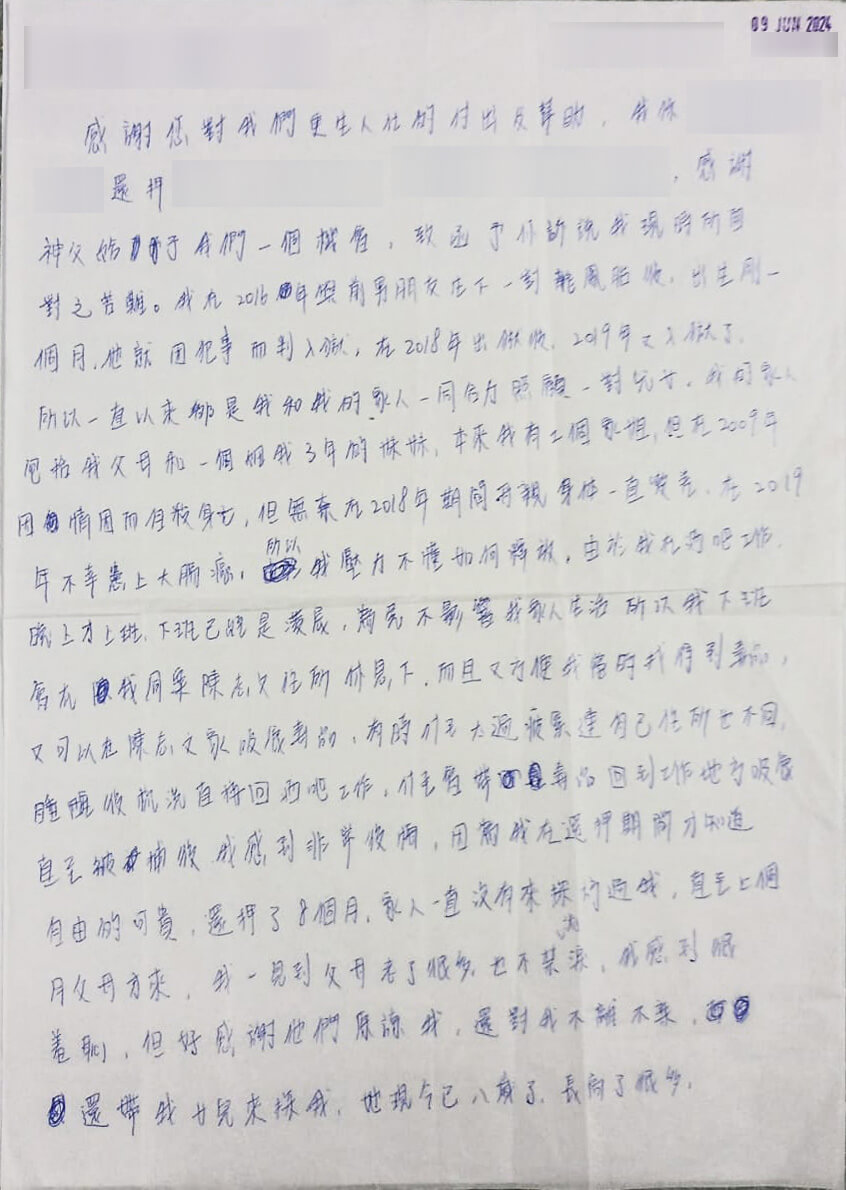 本人於2023年9月4日起因藏有危險藥物被捕。我在2016年與前男友生下一對龍鳳胎後,出生光一個月,他就因凡事而判入獄。在2018年出獄後,2019年又入獄了。所以一直以來都是我和我的家人一起合力照顧一對兒女。我的家人包括我父母和一個細我三年的妹妹。