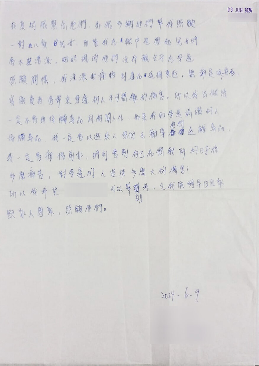 還柙了八個月,家人一直沒有來探訪過我,直至上個月父母才來。我一見到父母老了很多,也不禁落淚。我感到很羞恥,但好感謝他們原諒我,還對我不離不棄,還帶我女兒來探我,他現今已八歲了,長高了很多。
