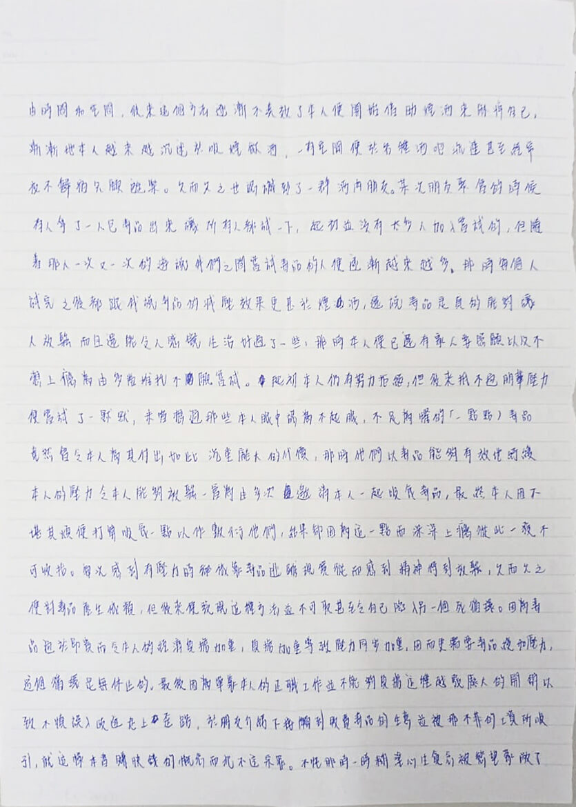 這所有的事情為本人帶來極為沉重的壓力。父親,母親,子女以及自己的生計,還有子女在獄中的父親,同時亦非常擔心母親的病情會否復發,同時要時常留意父親的情緒是否穩定。種種壓力皆令本人感到沉重不已,幾乎喘不過氣來,唯有於空閒時間外出散心短暫放鬆一下。亦因如此,本人於某次外出時結交了一些損友,並在他們的誘導下接觸毒品。那時每個人試完之後都跟我說毒品的減壓效果更甚於煙酒,還說毒品是真的能夠讓人放鬆,而且還能令人感覺生活上好過了一些。那是本人便以還有家人要照顧,以及不想上癮為由多番推搪不要嘗試。最終本人因不堪其煩,便打算吸食一點點以作敷衍他們,結果卻因為這「一點點」而深深上癮,從此一發不可收拾。