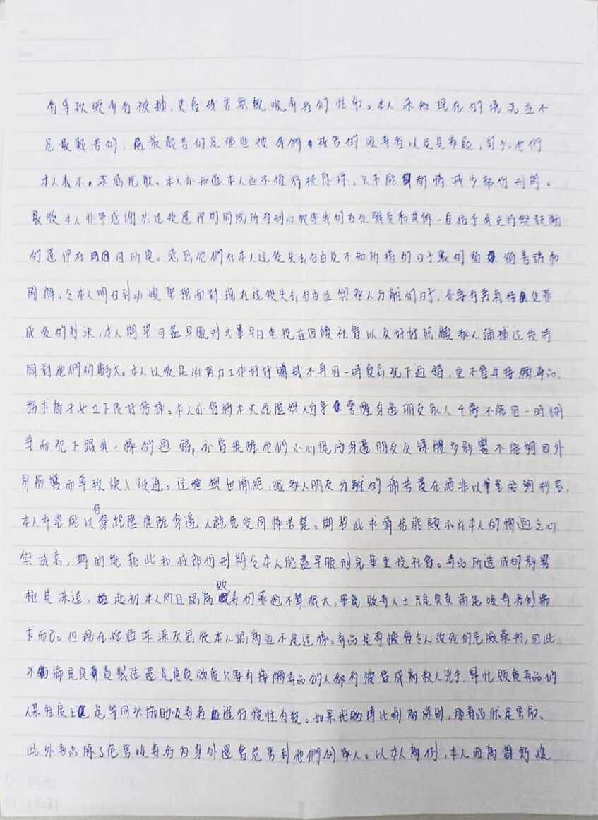 本人亦知現在的景況並不是最艱苦的,最艱苦的是那些被我們殘害的吸毒者以及其家庭,對於他們,本人表示深感抱歉。本人亦知道本人不值得被原諒,只求能酌情減少部份刑期,令本人盡量早服完刑後從投社會。