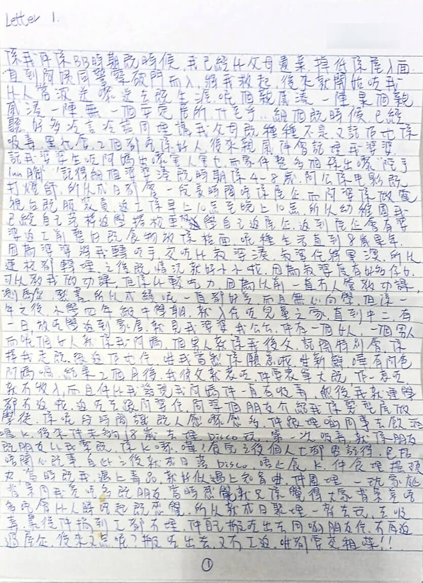 喺我仲係BB時期嘅時候,我已經被父母遺棄,調低喺屋企入面,直到阿姨同警察破門而入,將我救起,後來就開始咗我俾人當波送來送去嘅生涯。呢個親戚湊一陣,嗰個親戚湊一陣,冇一個安定居所。