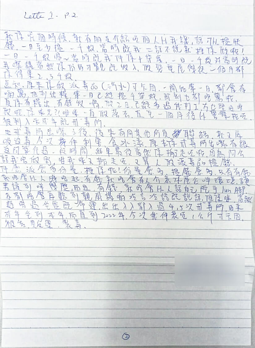 由戒毒所出嚟之後,後來有同其他所員聯絡,就又再吸返毒,今次仲厲害,食冰添。原本係戒毒所出嚟有跟返阿婆住過一段時間,結果最後當然係搬走咗啦,因為阿公話我唔做嘢,咁我咪又搬走咗,又幫人做派毒品搵錢,終於派越多份量。梗係啦!份量越多,搵錢錢越多,只有有錢就唔會俾人睇唔起,有錢就唔會有人介意你屋企咩環境,讀書讀到咩學歷。而且,有錢就唔會俾人話自己佗手掕腳,亦都唔會再聽到親戚講啲冷言冷語嘅說話。