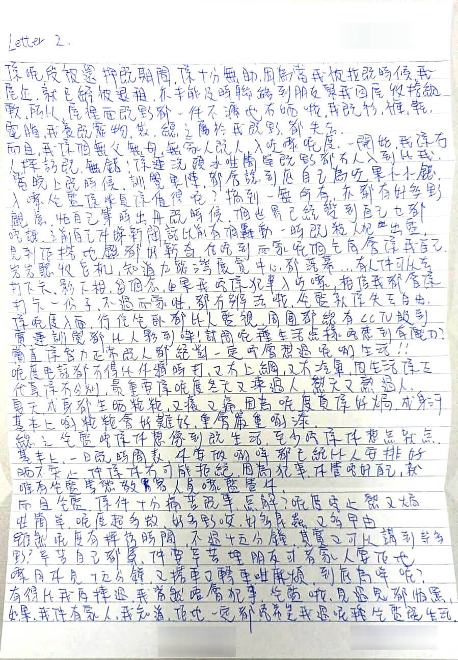 喺呢段被還押嘅期間,係十分無助,因為當我被拉嘅時候,我屋企,就已經被退租,亦未能及時聯絡到朋友幫我返屋企收拾細軟。所以,屋裏面嘅嘢都一件不留地冇晒啦。我嘅衫,褲,鞋,電腦,我養嘅寵物,袋,總之屬於我嘅嘢都失去。