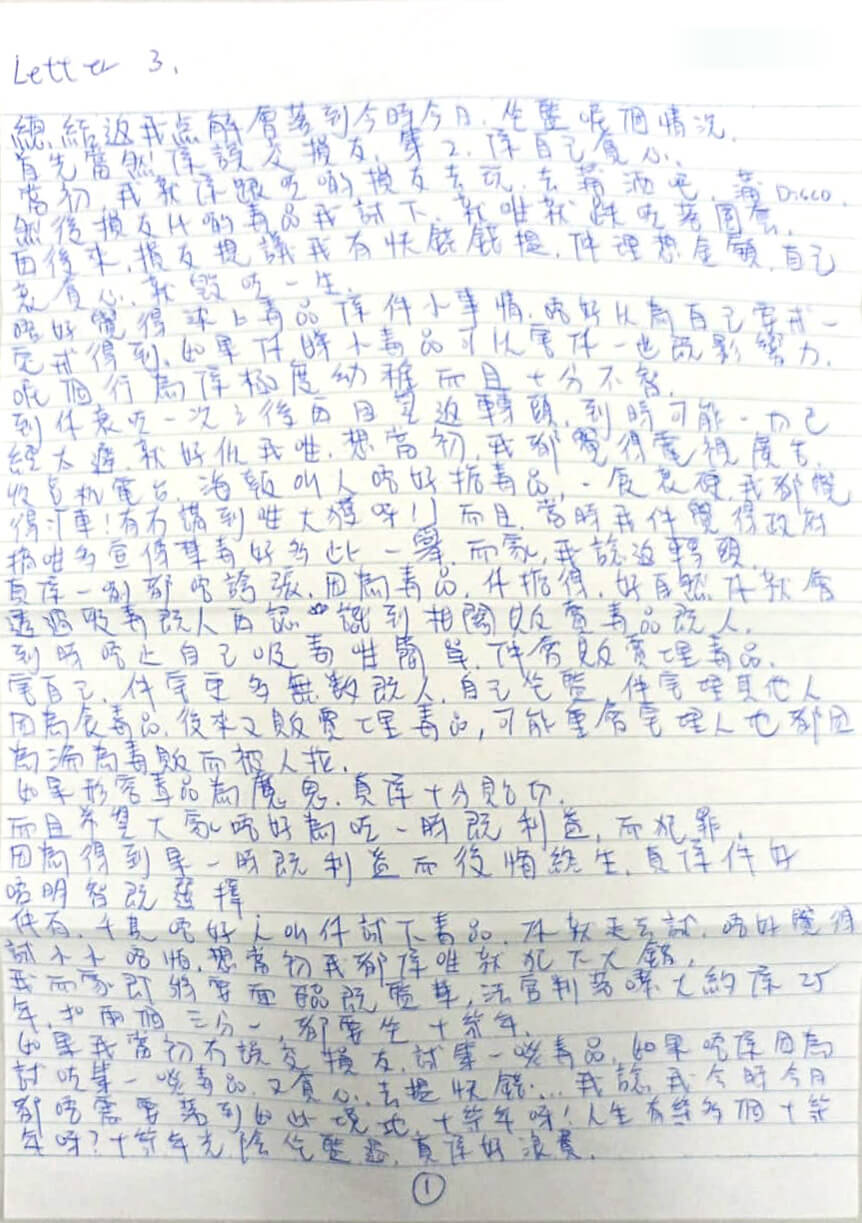 今次,我真真正正知錯,知道生命滿希望,前路由我創。出返去之後,我會好好做人,立定決心,腳踏實地搵份正職做。就算辛苦我都會捱落去,我會記住自己呢段坐監嘅非人生活。