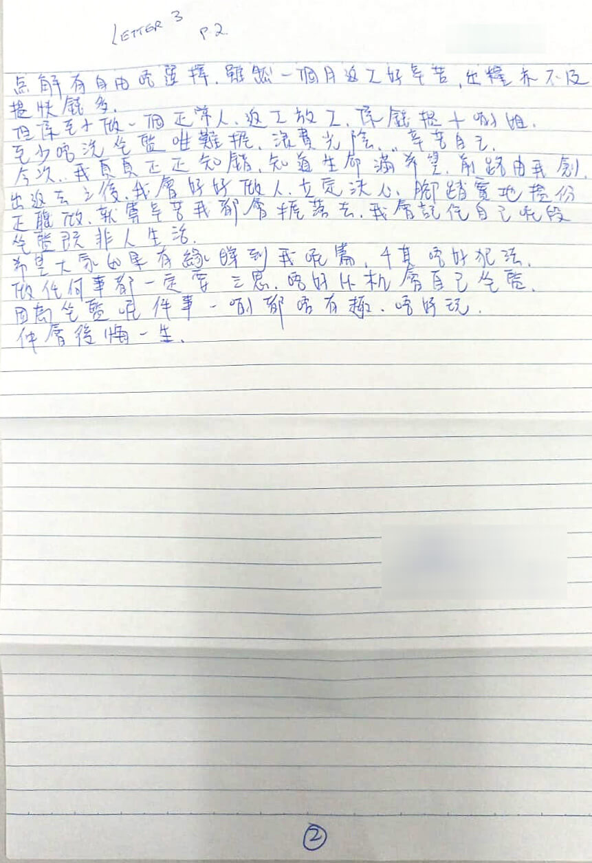 希望大家如果有緣睇到我呢篇信,千祈唔好犯法,做任何事都一定要三思,唔好俾機會自己坐監。因為坐監呢件事一啲都唔有趣,唔好玩,仲會後悔一生。
