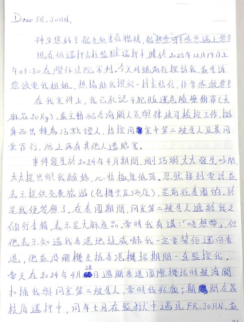 同年七月在監獄中遇見FR. JOHN,並獲選2本聖經書籍。經基督啓蒙,在每天也閱讀聖經。現我已48歲,已還押差不多20個月時間在監獄中。