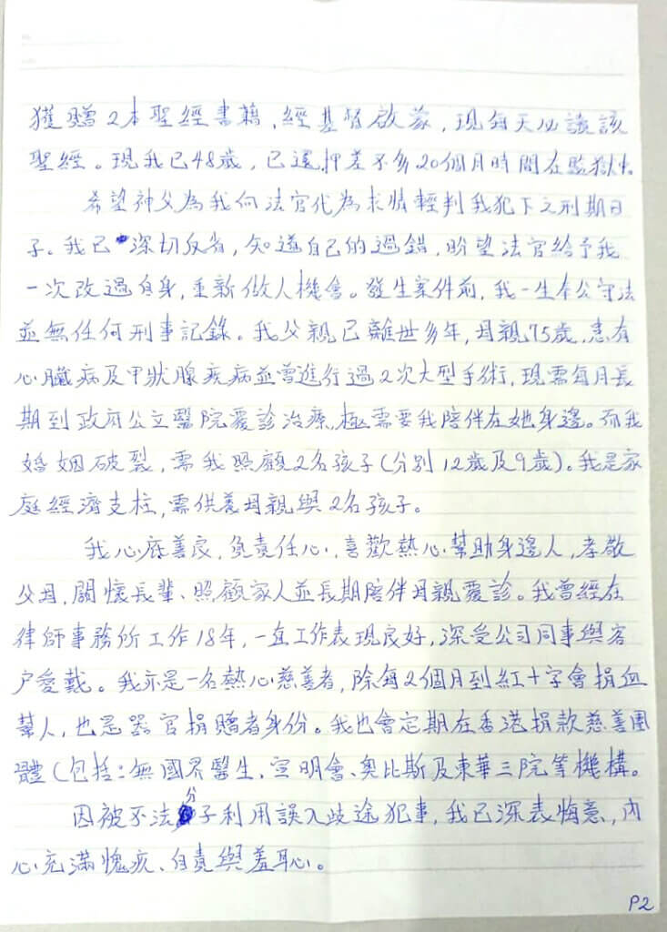 發生案件前,我一生奉公守法,並無任何刑事記錄。我父親已離世多年,母親75歲,患有心臟病及甲狀腺病,並曾進行過2次大型手術,現需每月長期到政府公立醫院覆診治療,極需要我陪伴在她身邊。而我婚姻破裂,需我照顧2名孩子(分別12歲及9歲)。我是家庭經濟支柱,需供養母親與2名孩子。