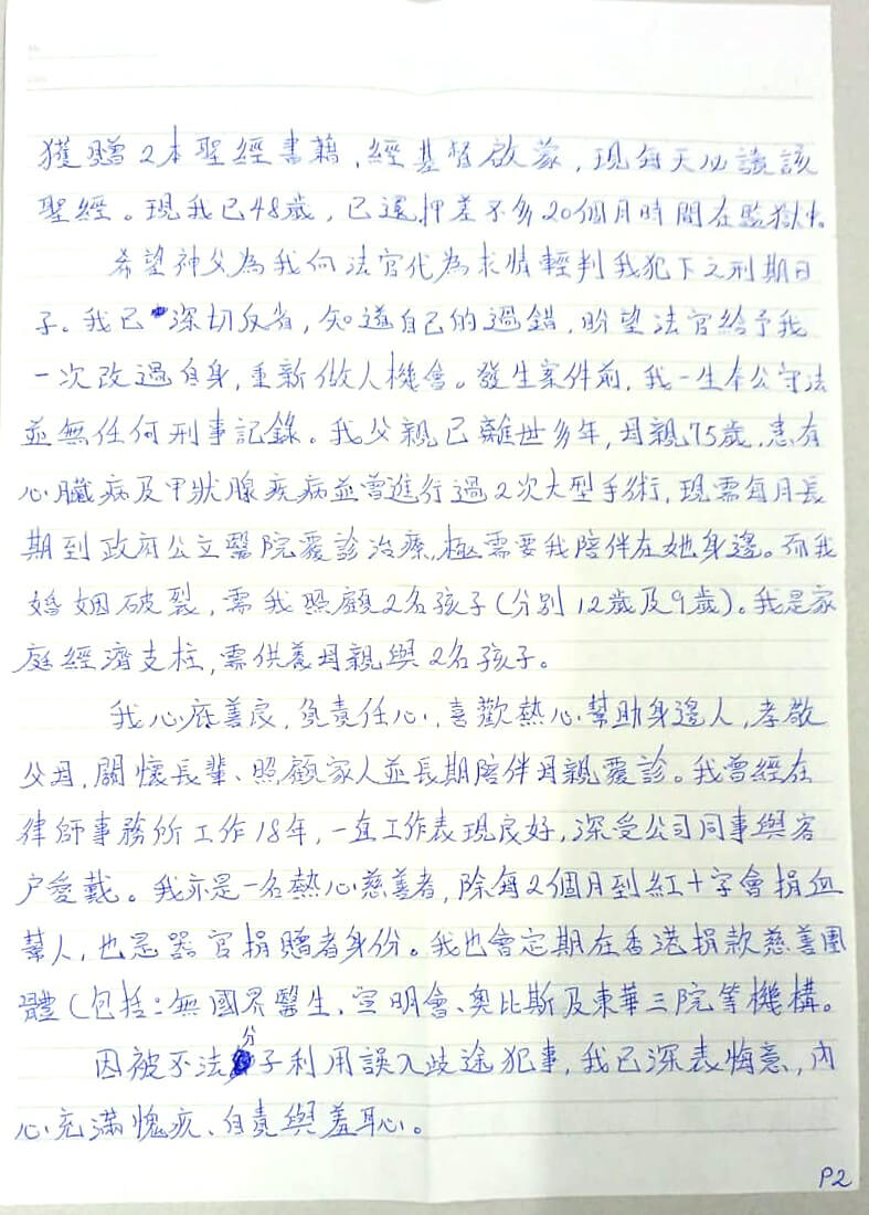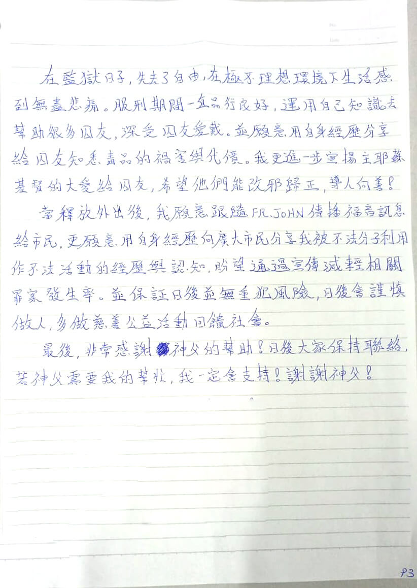 當釋放外出後,我願意跟隨FR. JOHN傳播福音訊息給市民,更願意用自身經歷向廣大市民分享我被不法份子利用作不法活動的經歷與認知,盼望通過宣傳減輕相關罪案發生率。並保證日後並無重犯風險,日後會謹慎做人,多做慈善公益活動回饋社會。